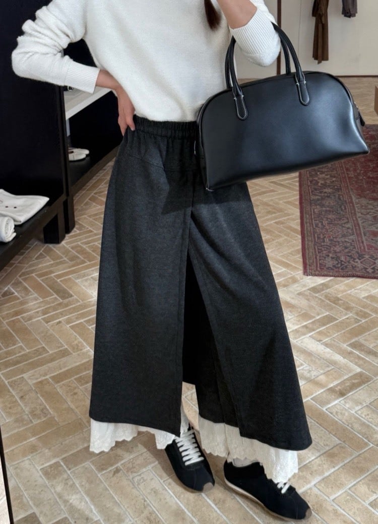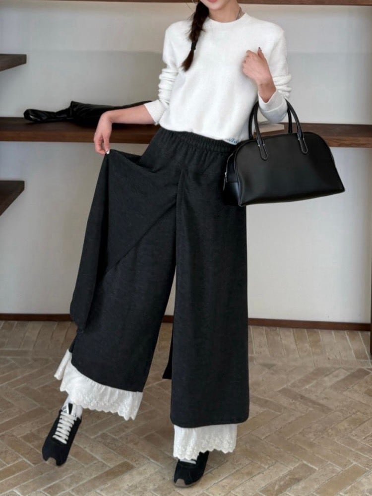 ふわっと動くワイドラインがスカートっぽいのに、レースが覗くデザインで一気にこなれ感アップ。