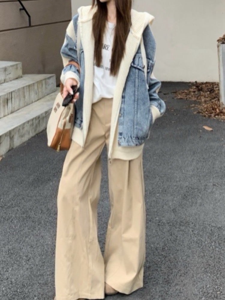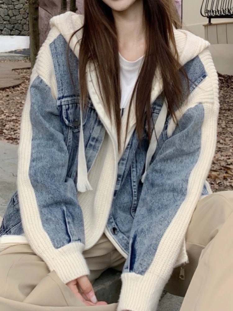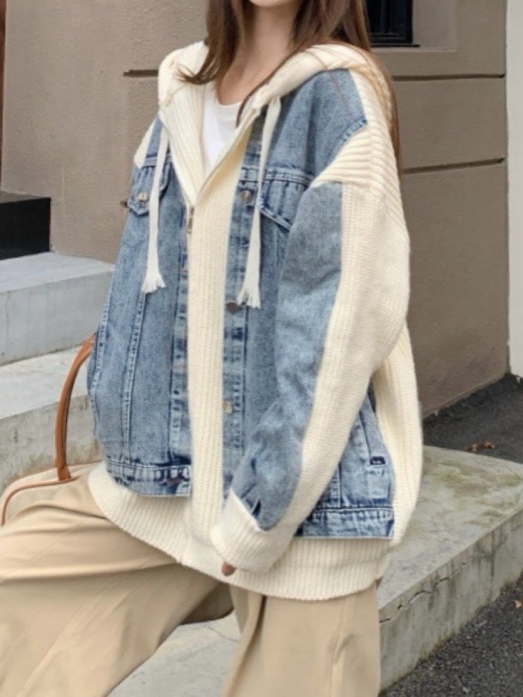 デニムとニットを絶妙に組み合わせた、思わず「可愛い!」と声が出る主役級アウター。ゆったりしたオーバーサイズと大きめフードが、韓国トレンドの“ゆるさ”をそのまま再現。