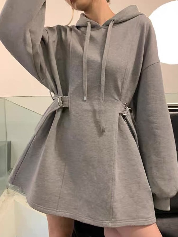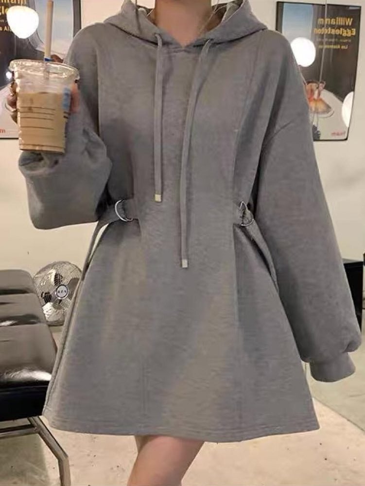 1枚でゆるかわスタイル完成 ウエストバックルフード付パーカーワンピース 秋冬 おしゃれ 大人可愛い リラクシー カジュアル くびれ 細見え 体型カバー 大きいサイズ 韓国 CH11222