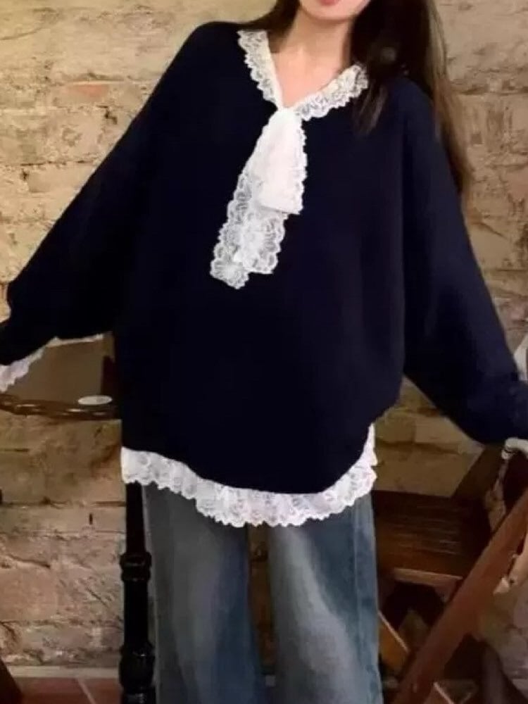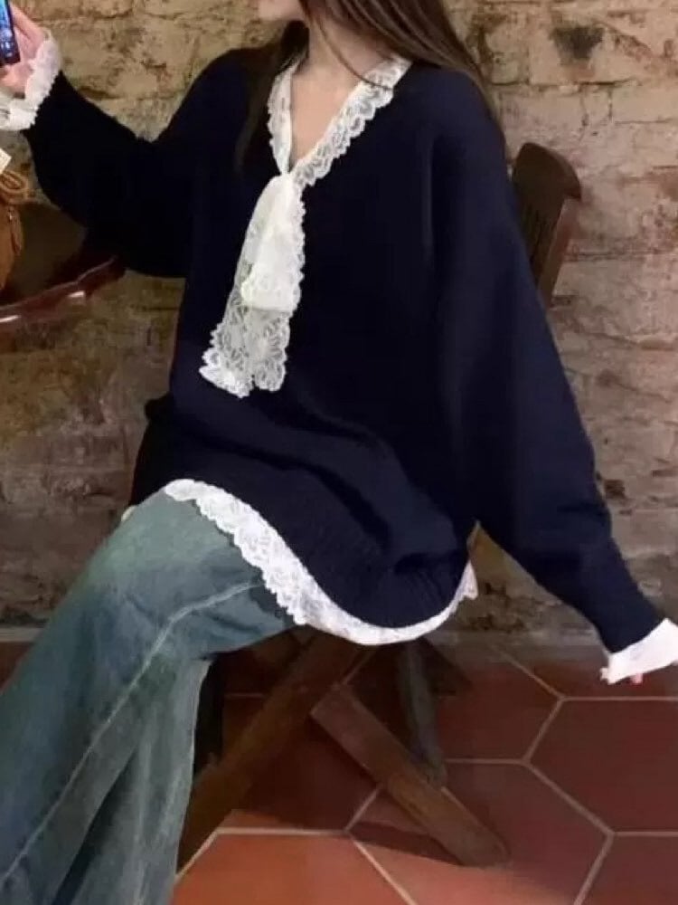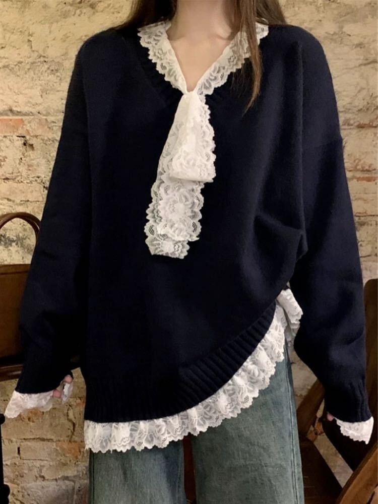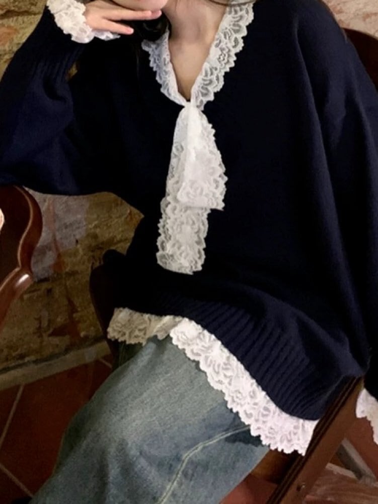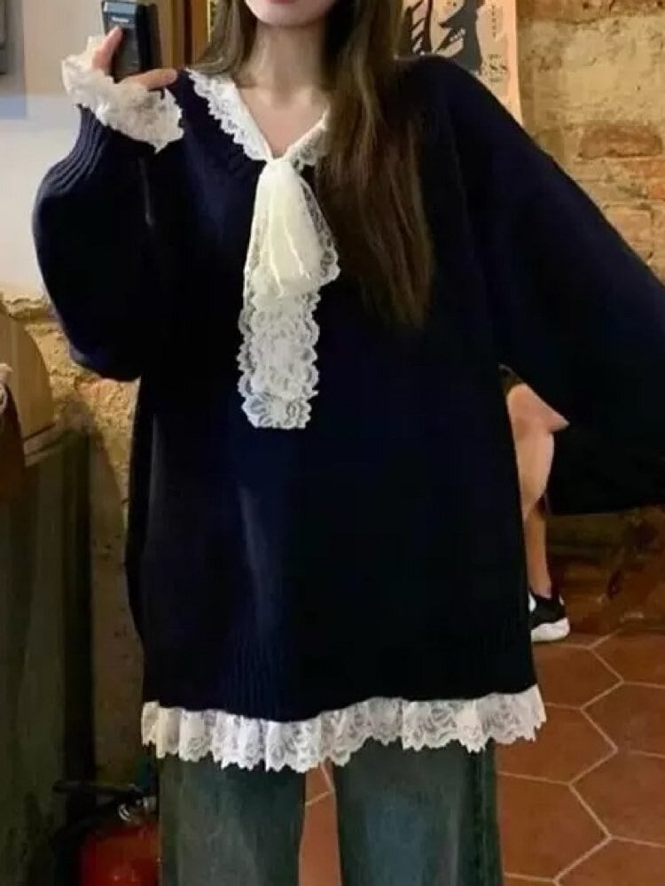 ふんわり纏って主役級ガーリー♡ レースリボンVネックニットチュニック おしゃれ 大人可愛い レース リボン ゆるかわ 差し色 Vネック リラクシー 体型カバー 大きいサイズ 韓国 CH11223