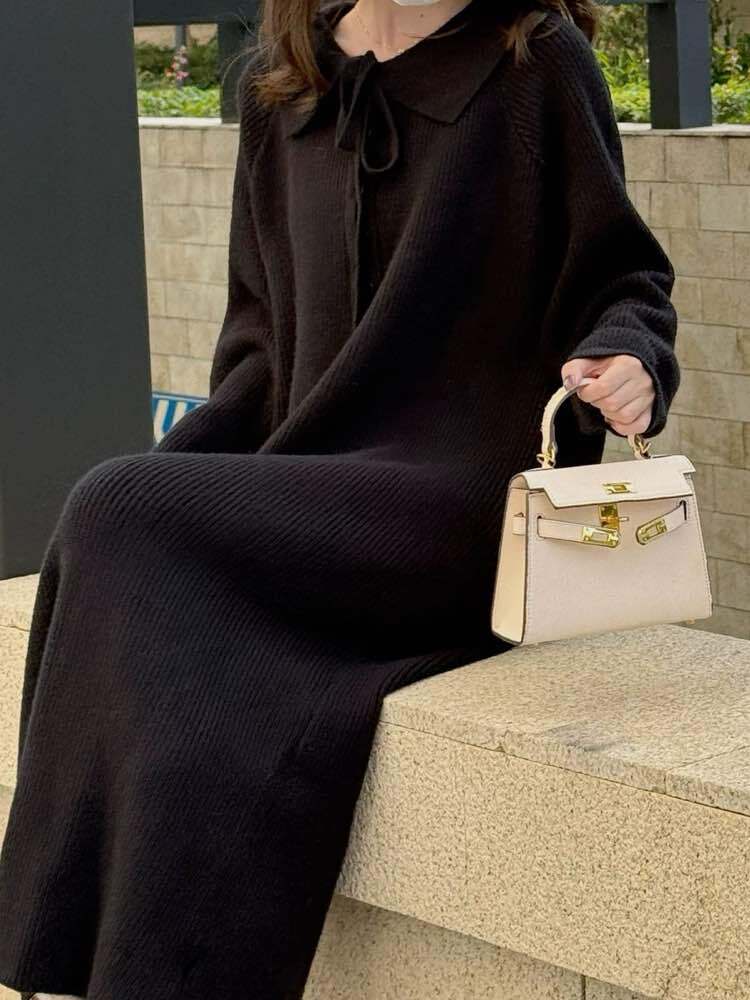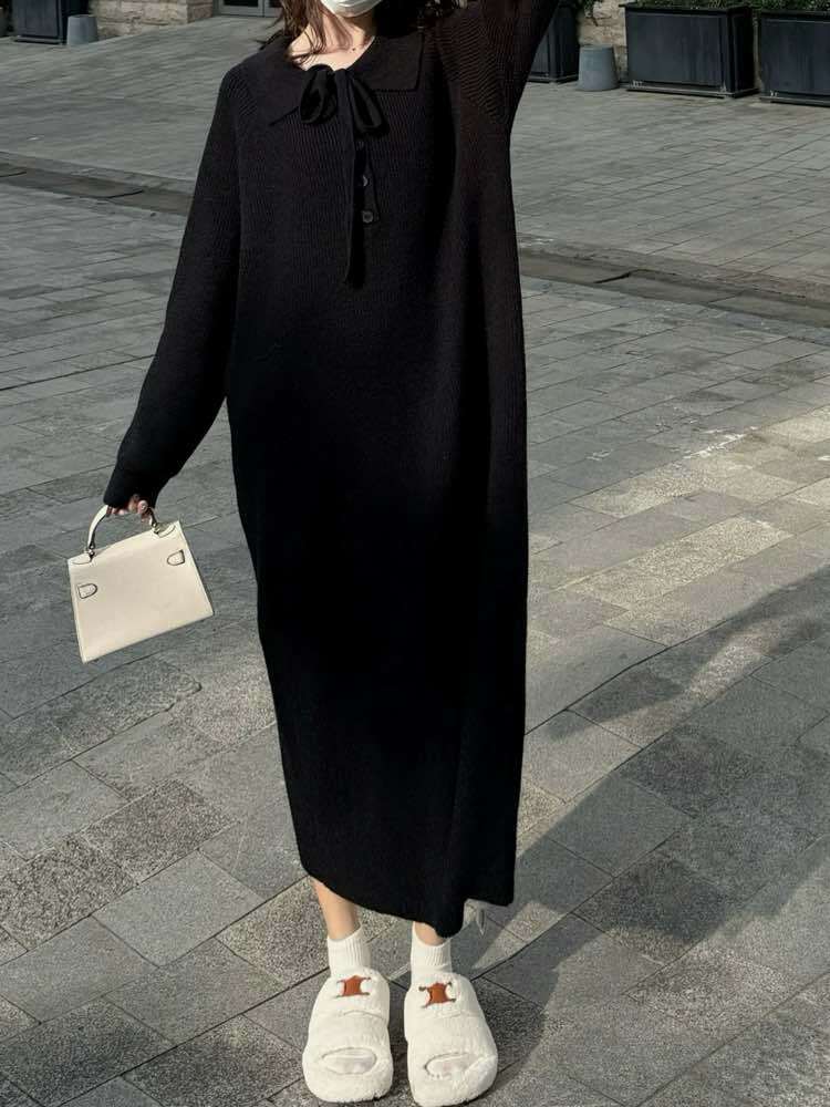 秋冬着たい大人のゆるワンピ フロントリボンリブニットワンピース 大人可愛い リブ ロング丈 おしゃれ リボン 暖か 体型カバー 大きいサイズ 韓国 CH11309
