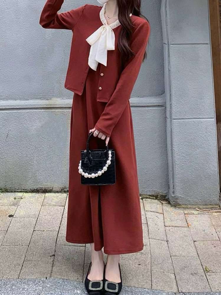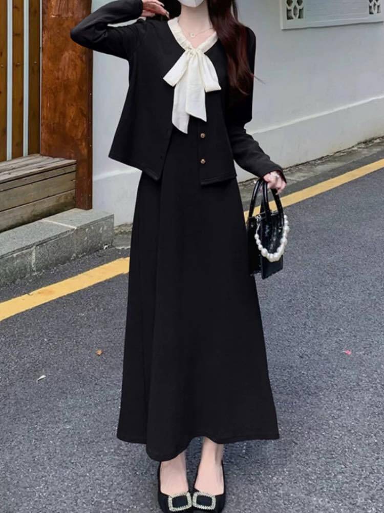 上品に着映えるお呼ばれスタイル 配色リボンカーディガン×キャミワンピースセットアップ 大人可愛い おしゃれ リボン 上品 高見え バイカラー ロング丈 セット お呼ばれ 食事会 デート 脚長 細見え 体型カバー 大きいサイズ 韓国 CH11287