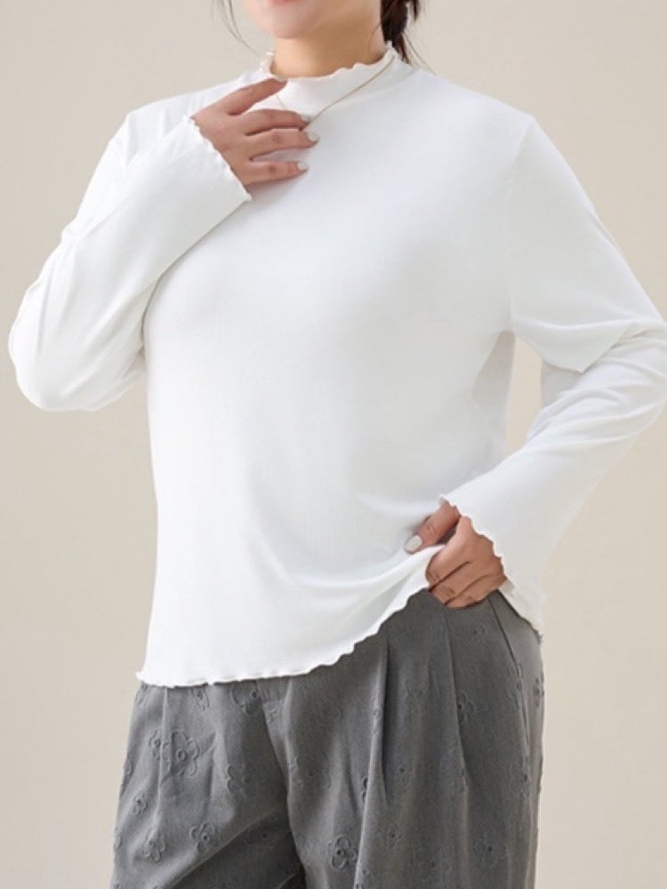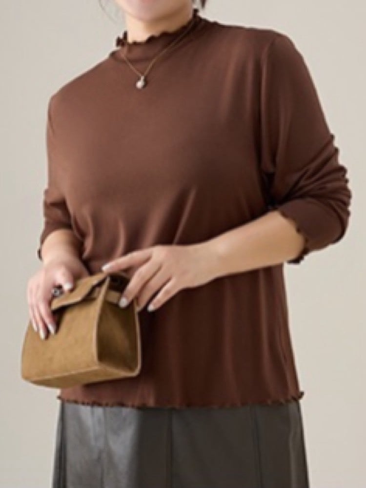 柔らかく伸びるリブ素材が身体に優しく寄り添い、窮屈感のない着心地を叶えるモックネックトップス。
