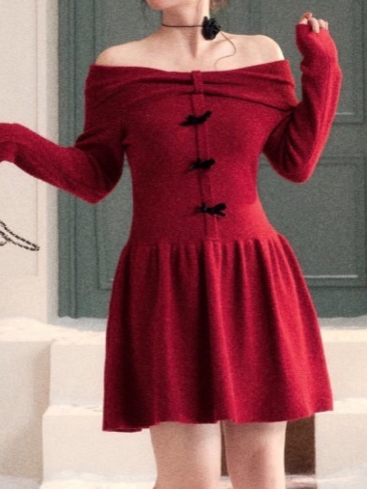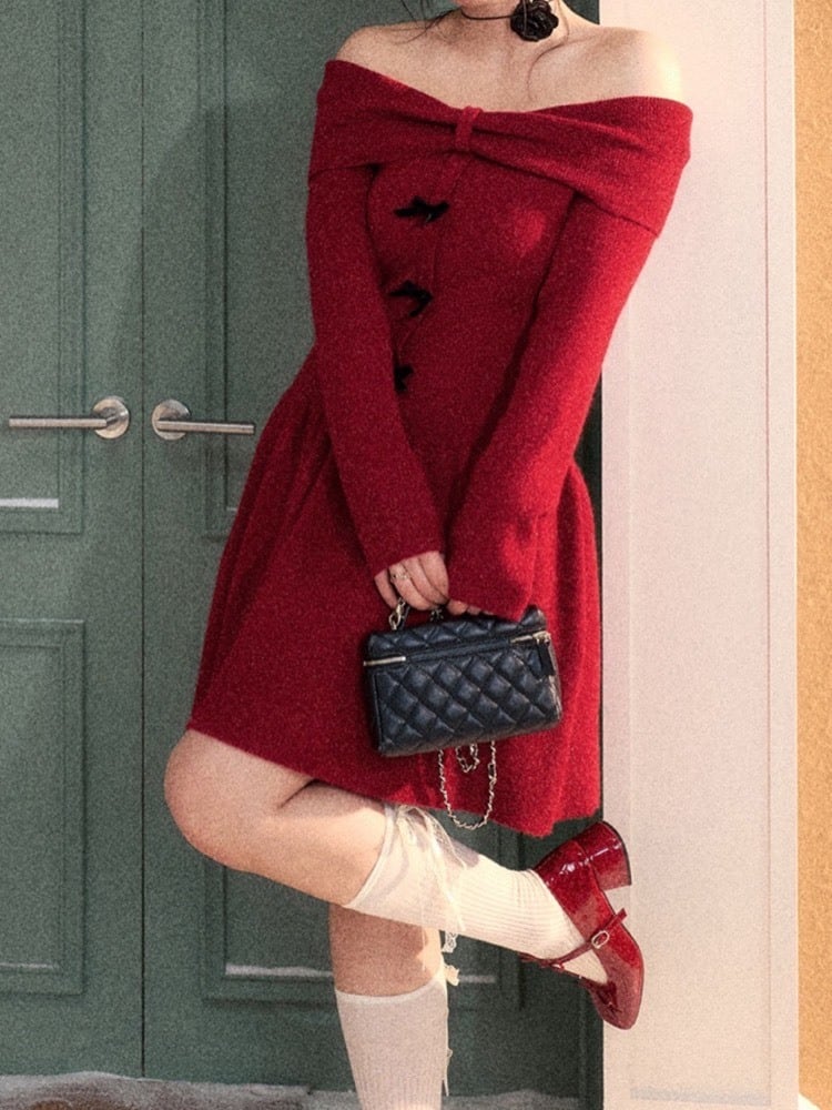冬の街でひときわ輝く、主役級の赤ニットワンピース。