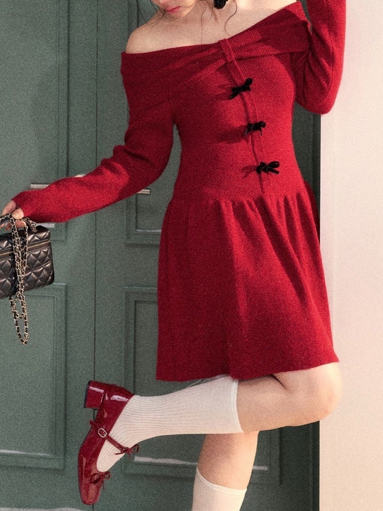 写真映え100% オフショルリボンワンピース 長袖 大人可愛い ミニ丈 おしゃれ クリスマス デート 女子会 細見え 体型カバー 大きいサイズ 韓国 CH11312