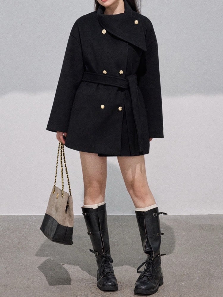 今っぽさ全部乗せ!韓国ムード漂う ビッグカラーAラインコート ベルト付き ショート丈 アウター ゴールドボタン おしゃれ 小顔効果 体型カバー 大きいサイズ 韓国 CH11316