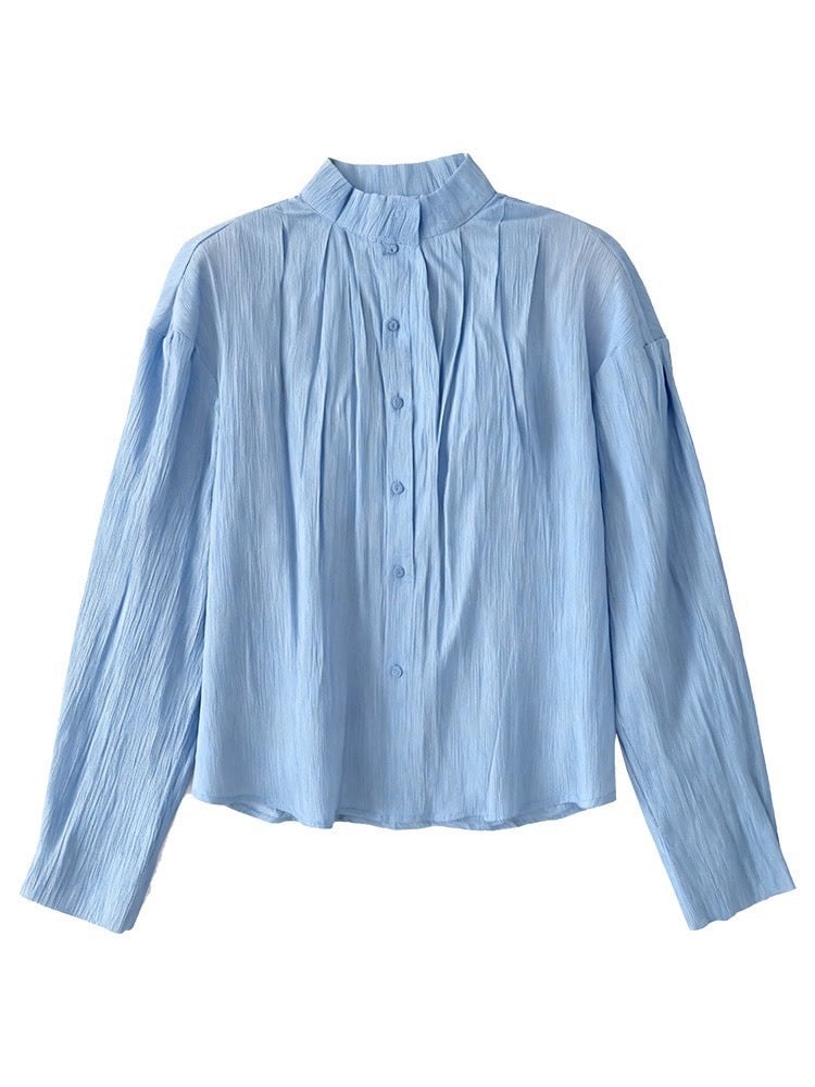 上品なとろみ感と、ふんわりとしたボリューム袖が魅力のスタンドカラーブラウス。