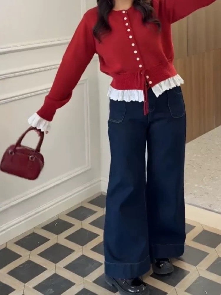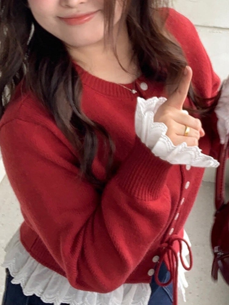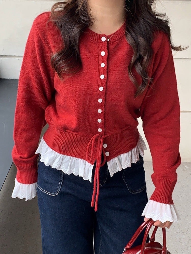 きゅっと結んでふんわり可愛い ウエストリボン×フリル裾ニット ペプラム きれいめ 前ボタン フェミニン おしゃれ 体型カバー 大きいサイズ 韓国 CH11359