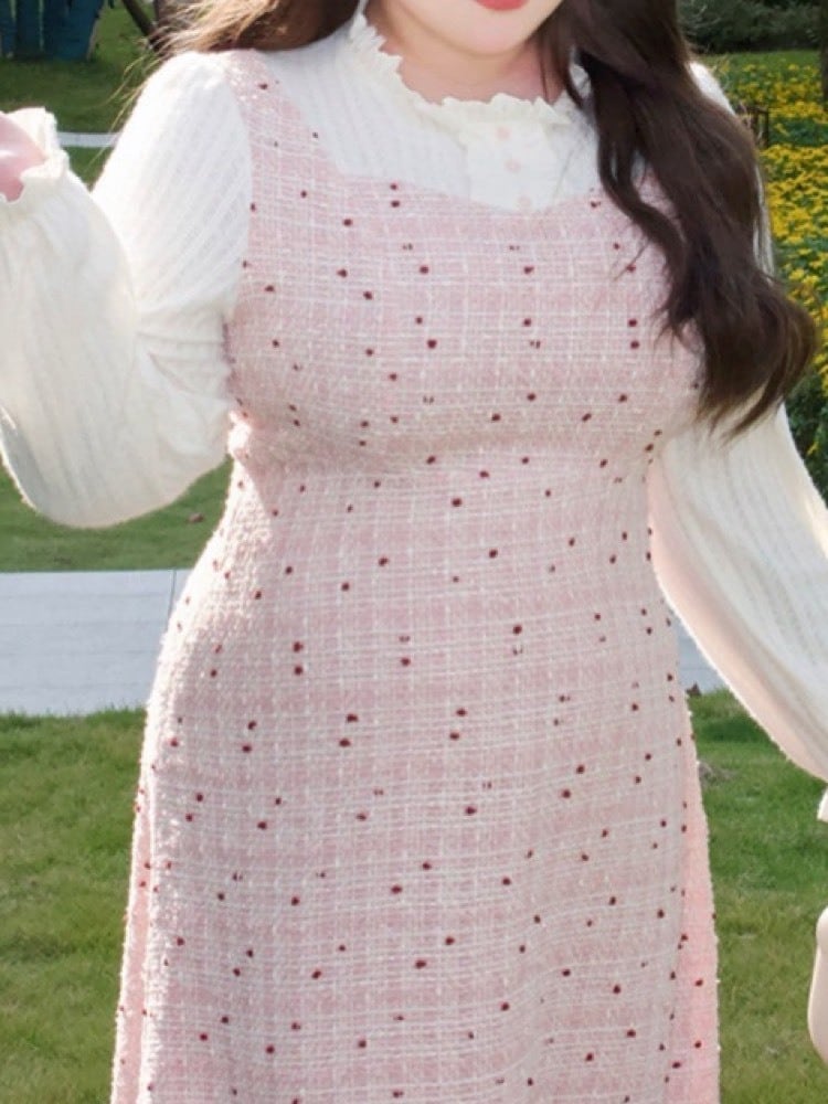やさしいピンクで可愛いを品よく ツイードジャンスカ風ワンピース 淡色コーデ ピンク ナチュラル 大人可愛 上品 細見え 体型カバー 大きいサイズ 韓国 CH11364