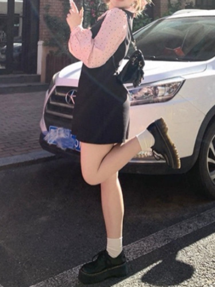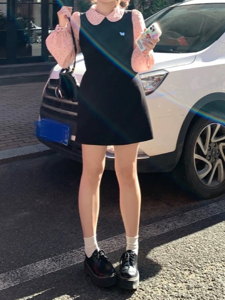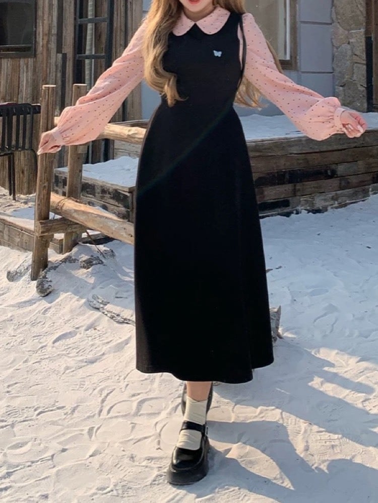 ジャンスカ風のブラックワンピースが全体を引き締め、スタイルアップも叶えます。