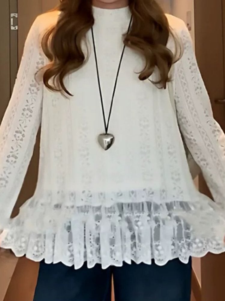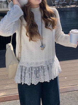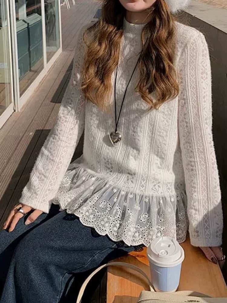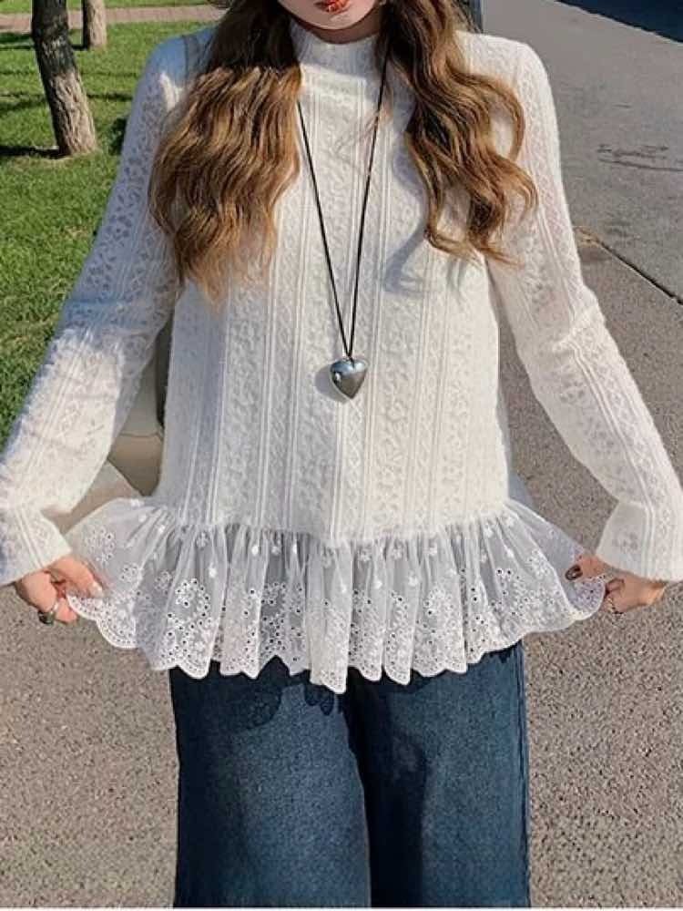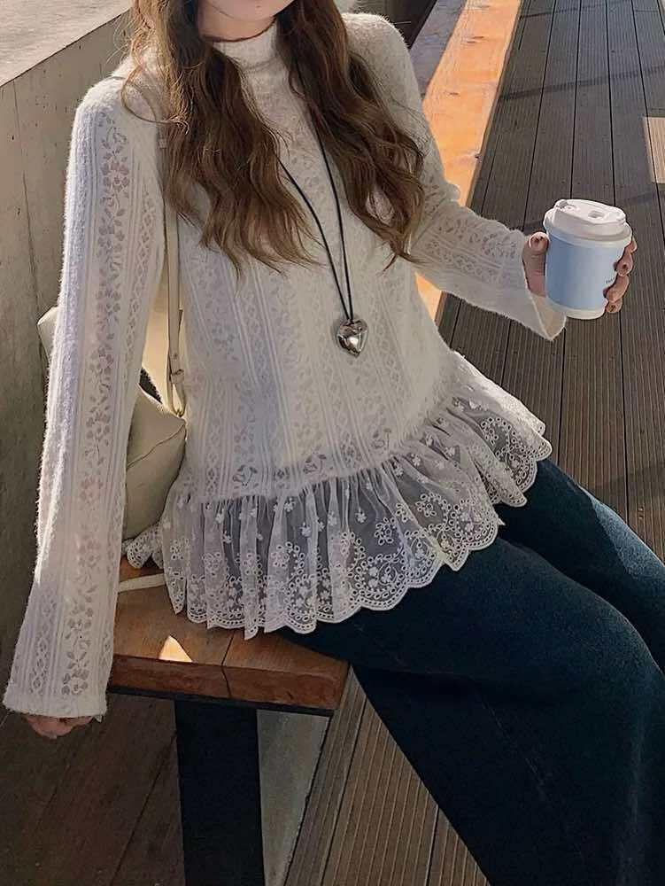 インナーも主役も着回し自在! ハイネックレーストップス 長袖 大人可愛い レース シアー 透け感 清楚 上品 重ね着 おしゃれ 細見え 大きいサイズ 韓国 CH11330