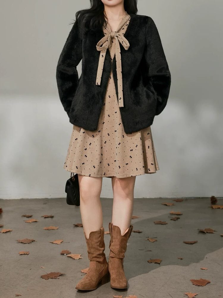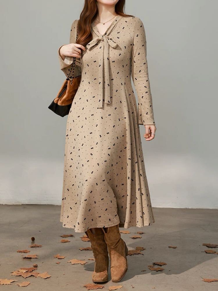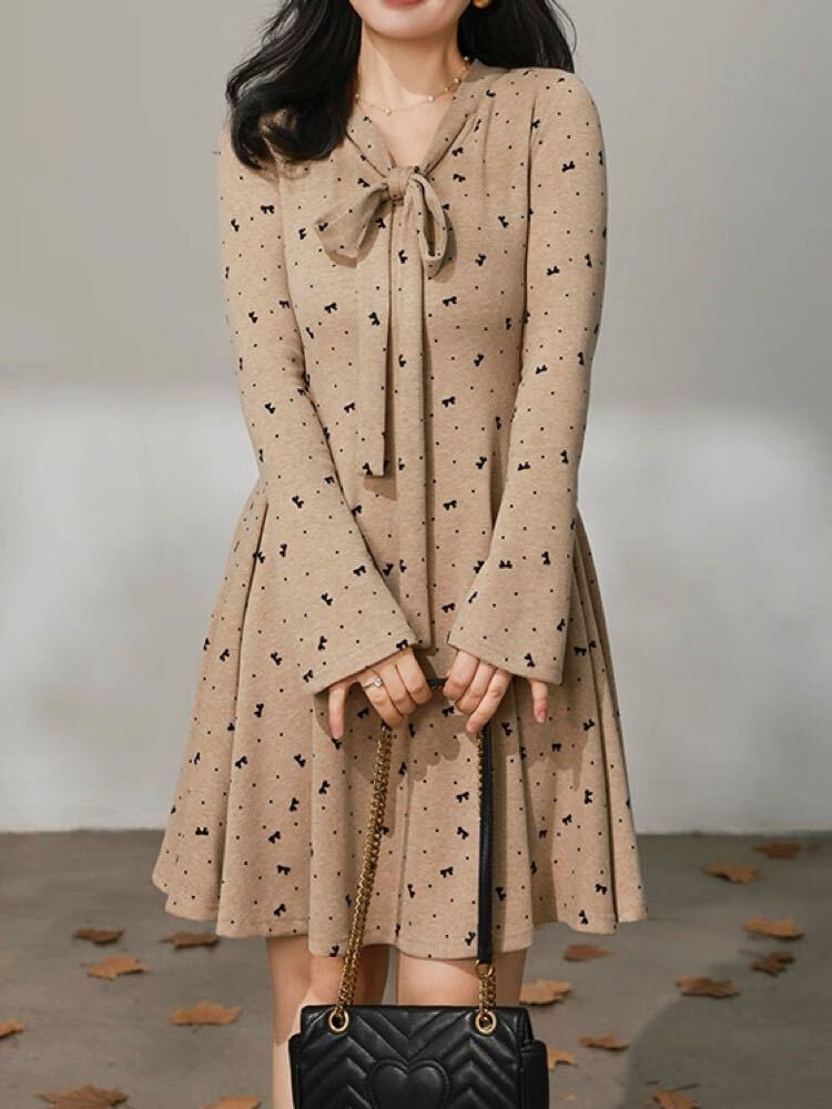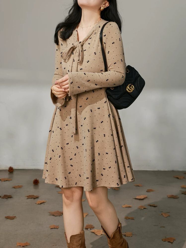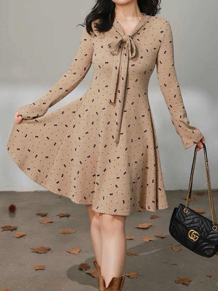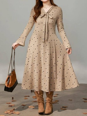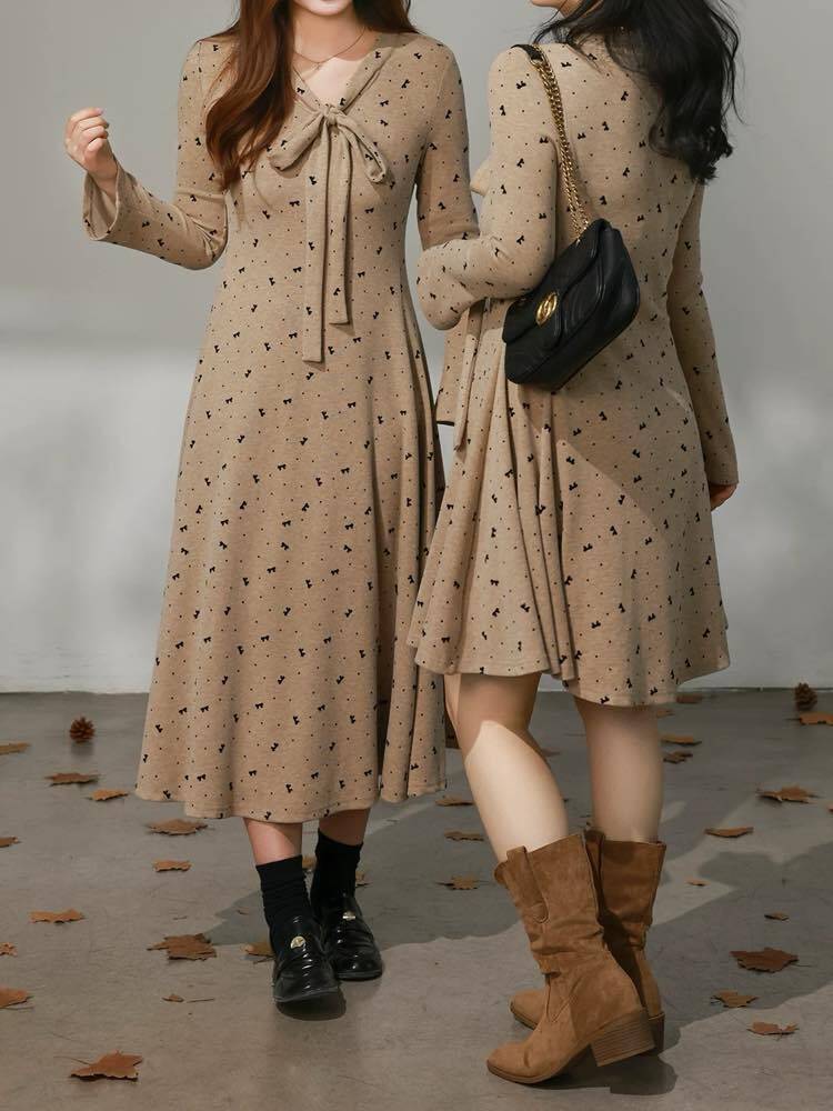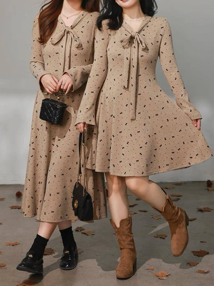 見れば見るほどかわいい♡ 丈が選べる リボンドット柄ワンピース 大人可愛い リボン ドット柄 おしゃれ ミニ丈 ロング丈 Aライン Vネック 体型カバー 大きいサイズ 韓国 CH11337