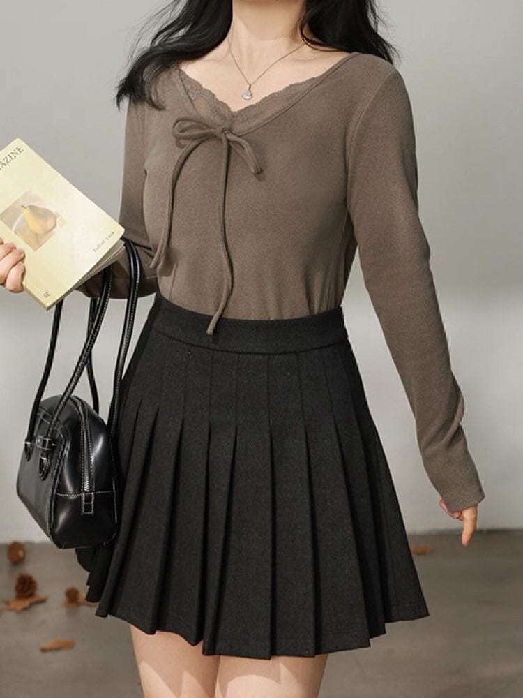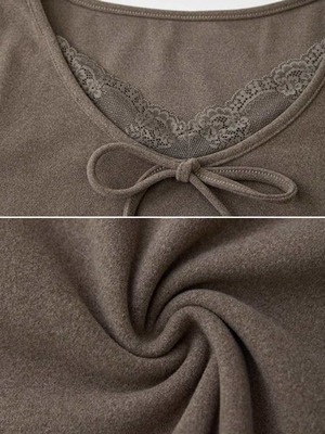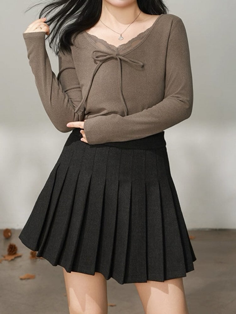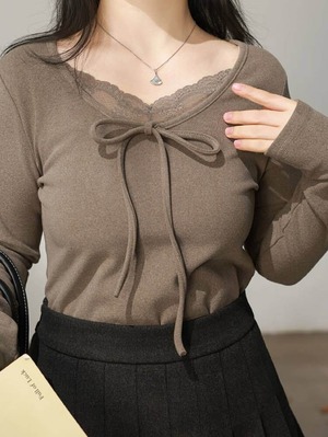 胸元レースで大人かわいく魅了 フロントリボンVネックプルオーバー 長袖 リボン レース 大人可愛い おしゃれ シンプル Vネック ナチュラル カジュアル ガーリー 着回し 体型カバー 大きいサイズ 韓国 CH11338