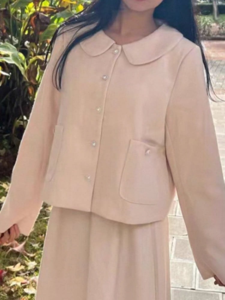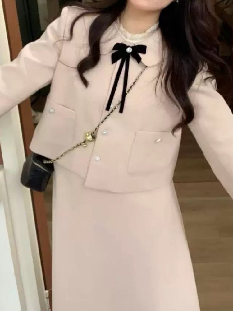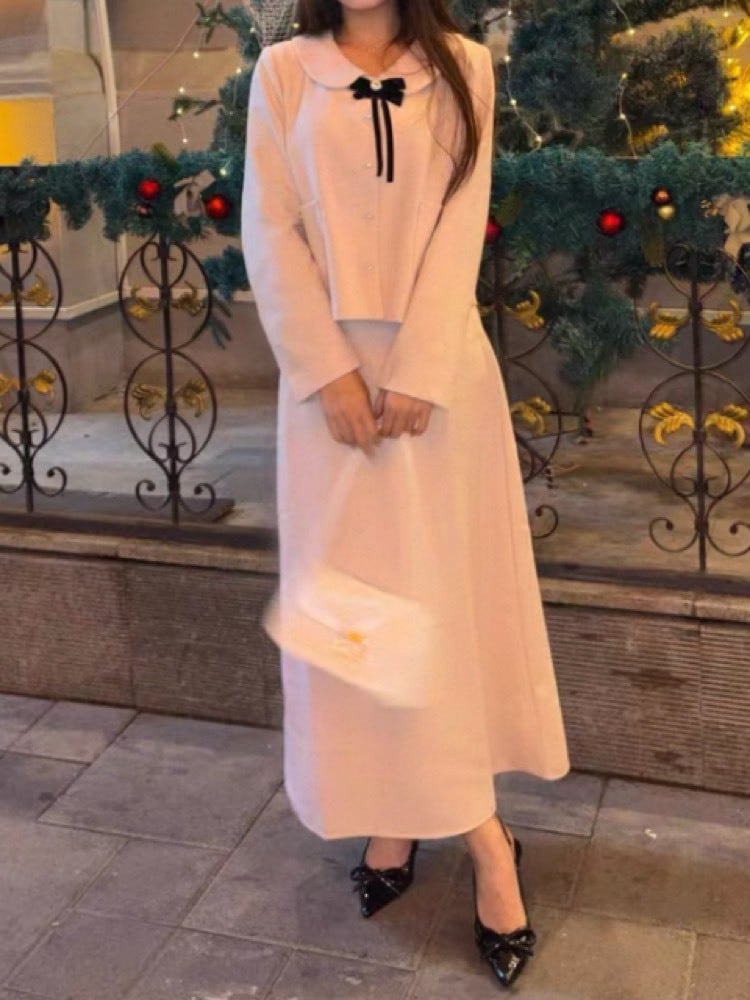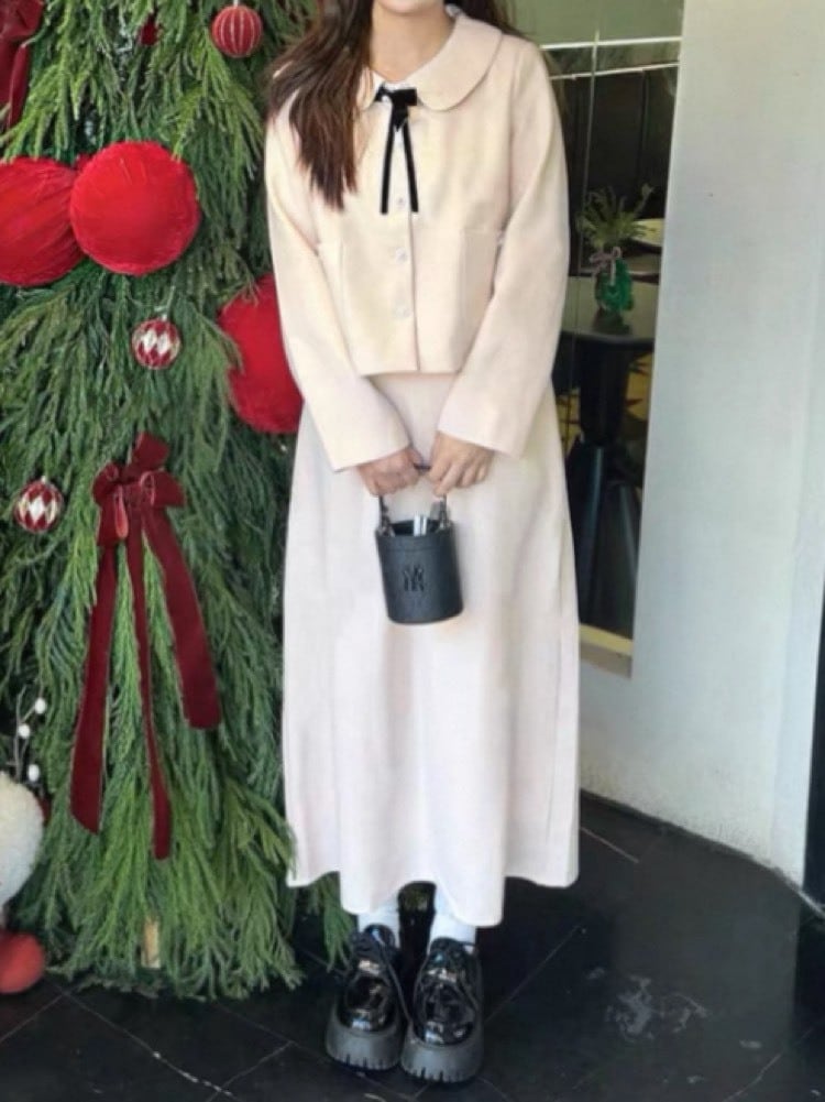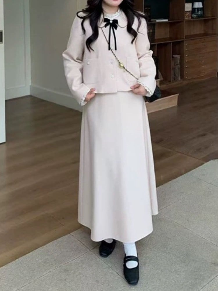 凛とやさしく品のある可愛さ リボン付き丸襟ジャケット×ロングスカート セットアップ 大人可愛い お洒落 中綿 体型カバー 冬 コーデ セット 大きいサイズ 韓国 CH11378