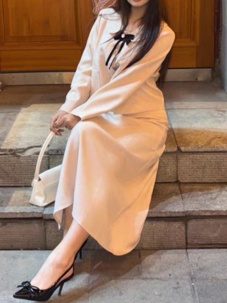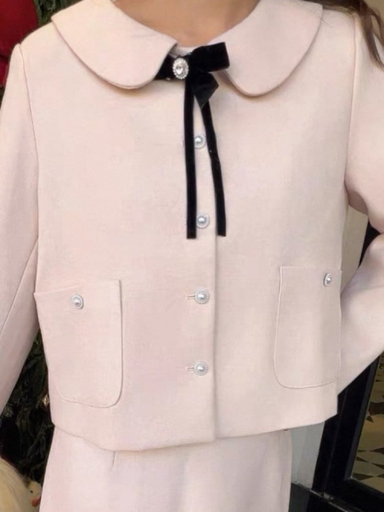 丸みのある襟元とブラックリボンが、甘さを抑えた大人可愛いアクセントに。