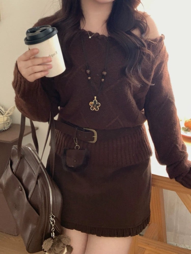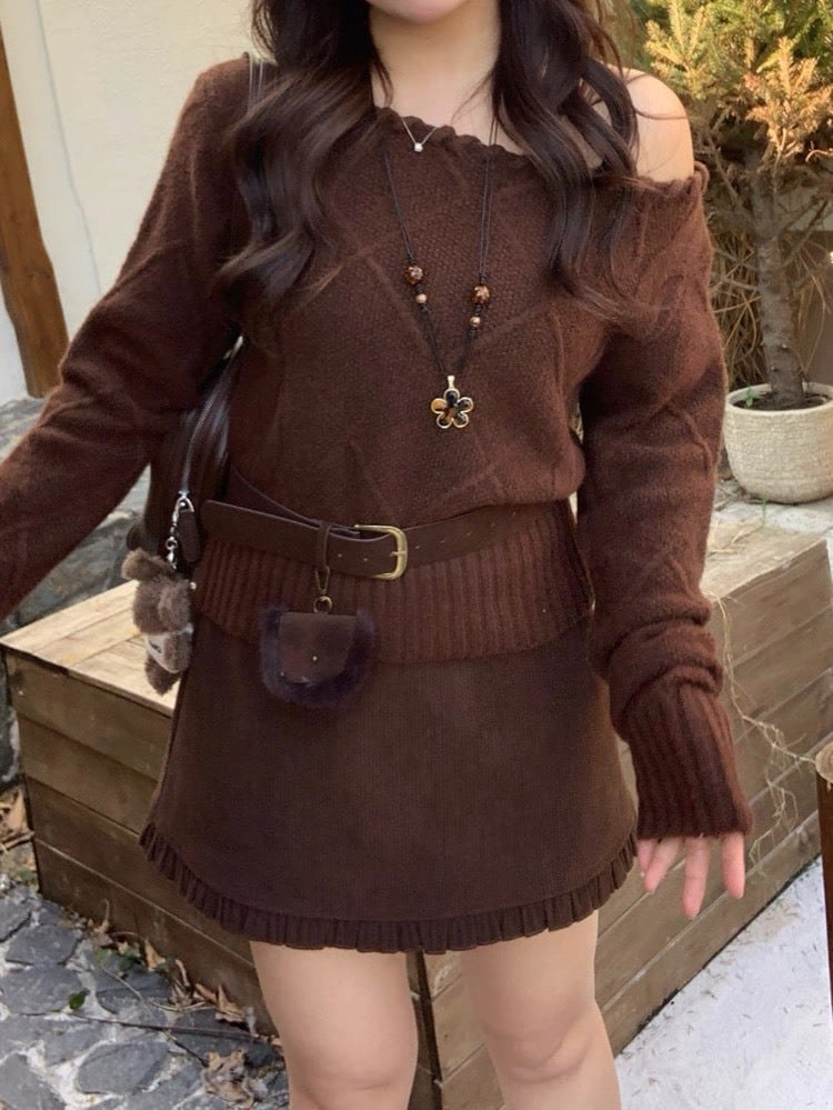 トレンド感たっぷりのロープデザイン襟が目を引く、オフショルニットとベルトのセット。