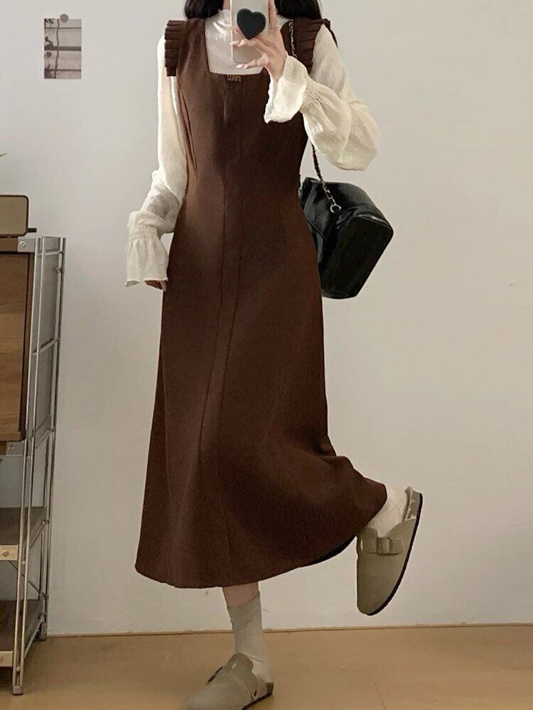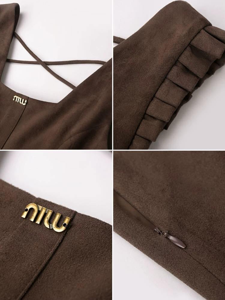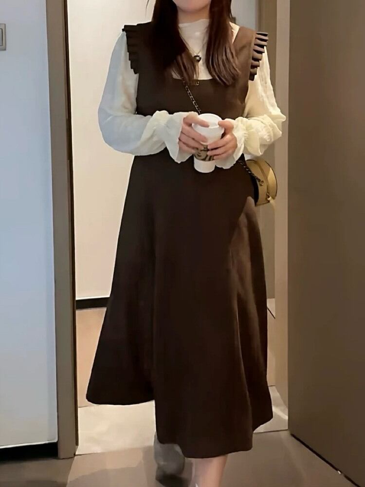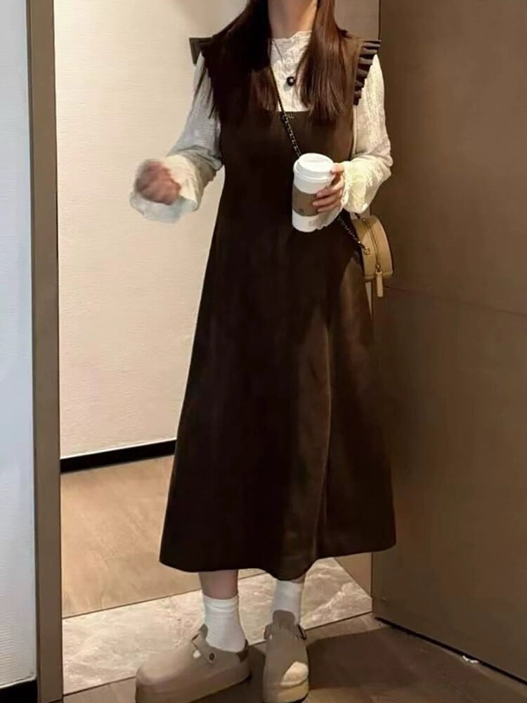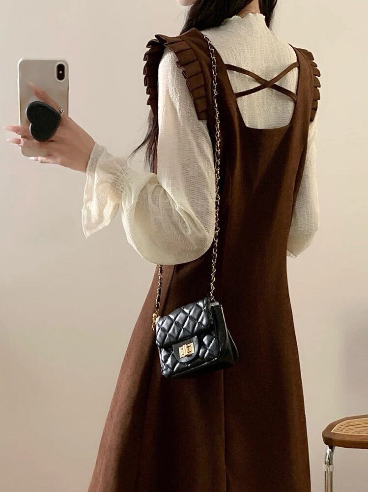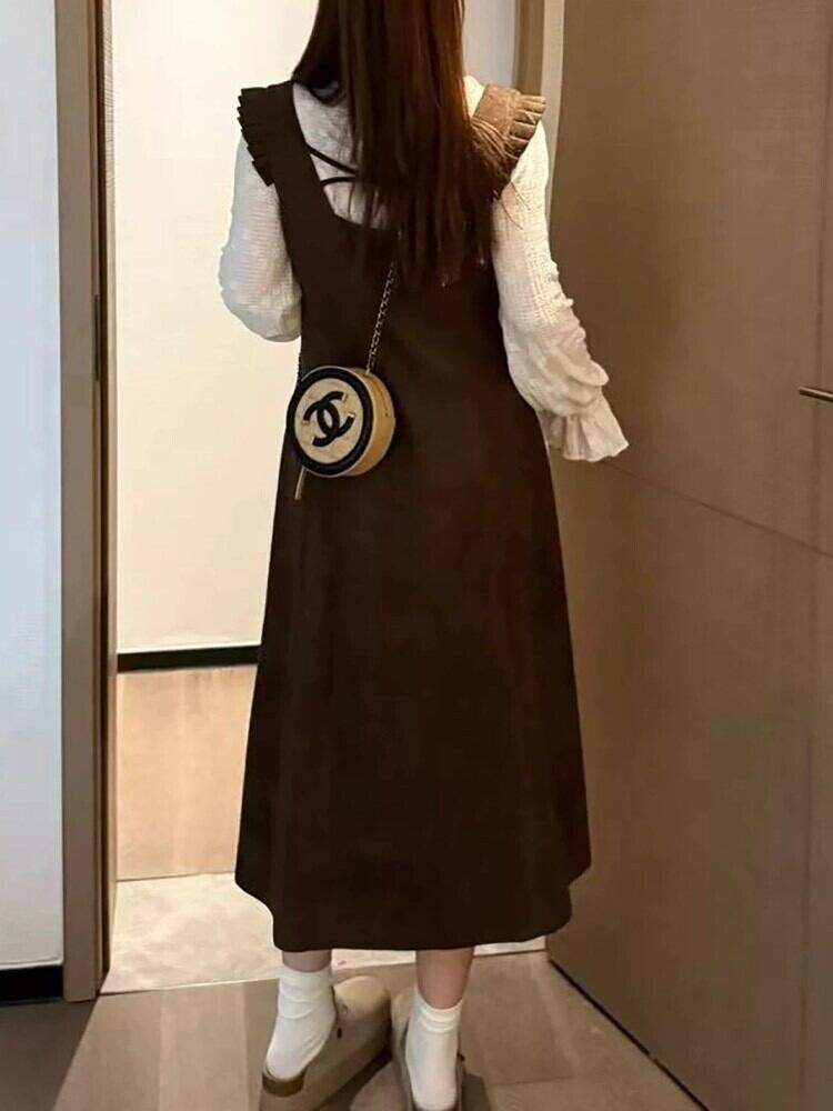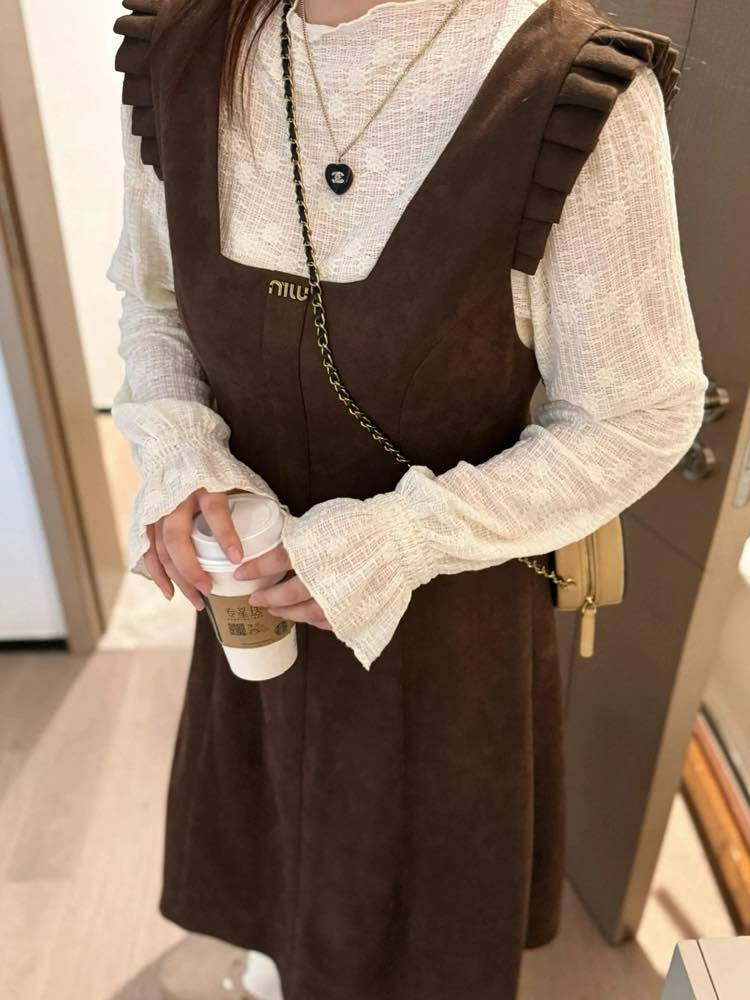ほんのり甘ディテールで魅せる♡ スエード調肩フリルジャンパースカート 大人可愛い おしゃれ フリル レースアップ ゴールド ロゴ ガーリー スクエアネック ロング丈 体型カバー 大きいサイズ 韓国 CH11342
