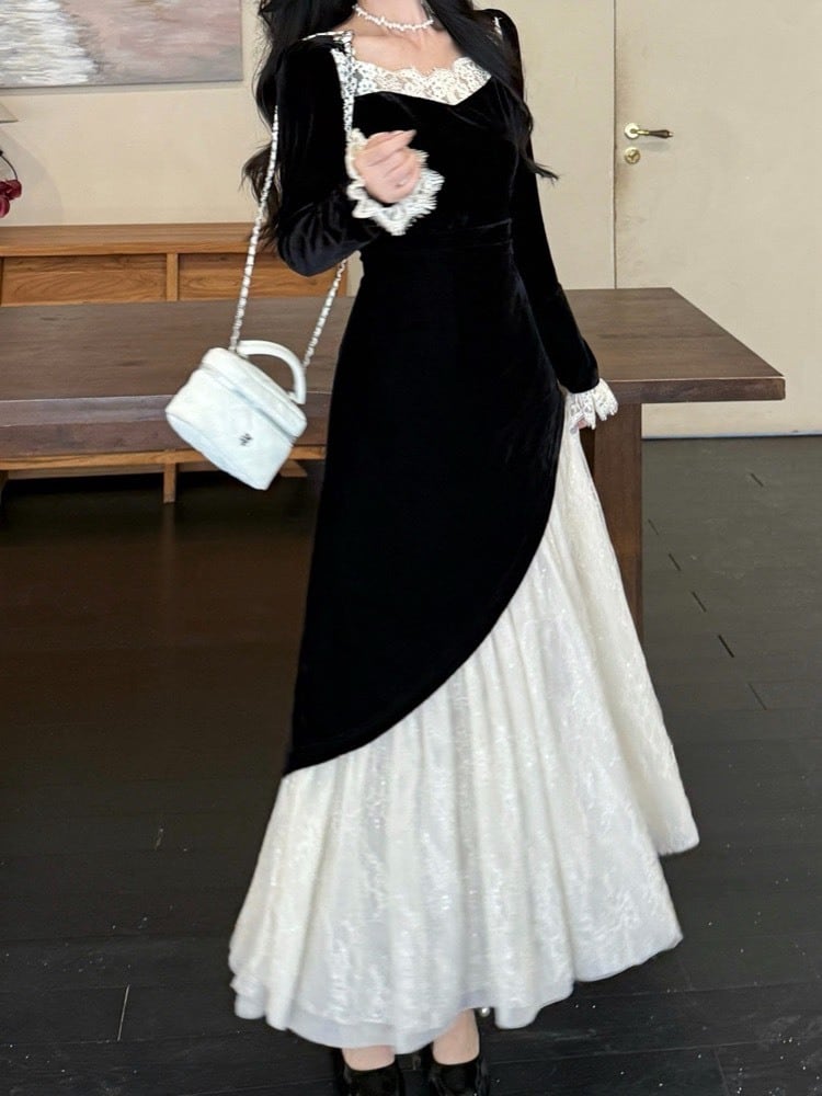 纏うだけで視線を奪う ベロア×レースの主役級ロングワンピース 大人可愛い お洒落 ロング丈 肌見せ レース 異素材 バイカラー 細見え くびれ 体型カバー 大きいサイズ 韓国 CH11430