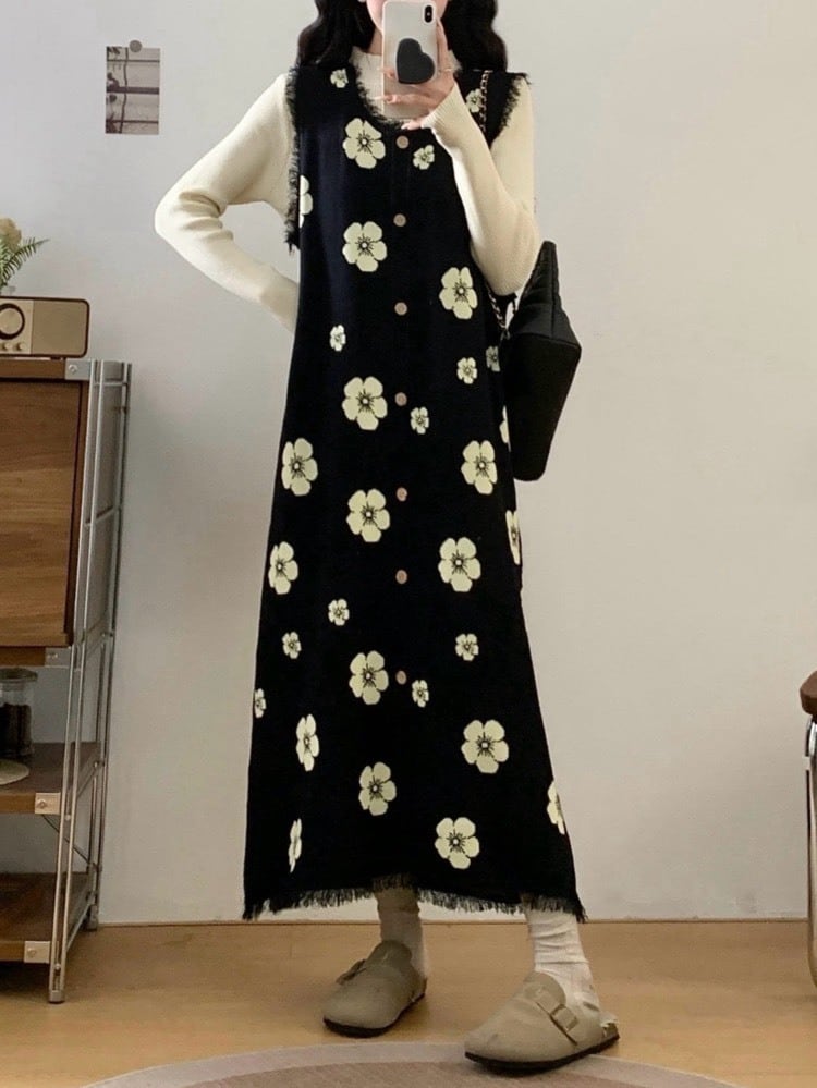 重ねるだけで完成 大人の花柄レイヤードワンピースセット 2点セット リブトップス 大人可愛い 上品 ロング丈 お呼ばれ デート 脚長 体型カバー 大きいサイズ 韓国 CH11426