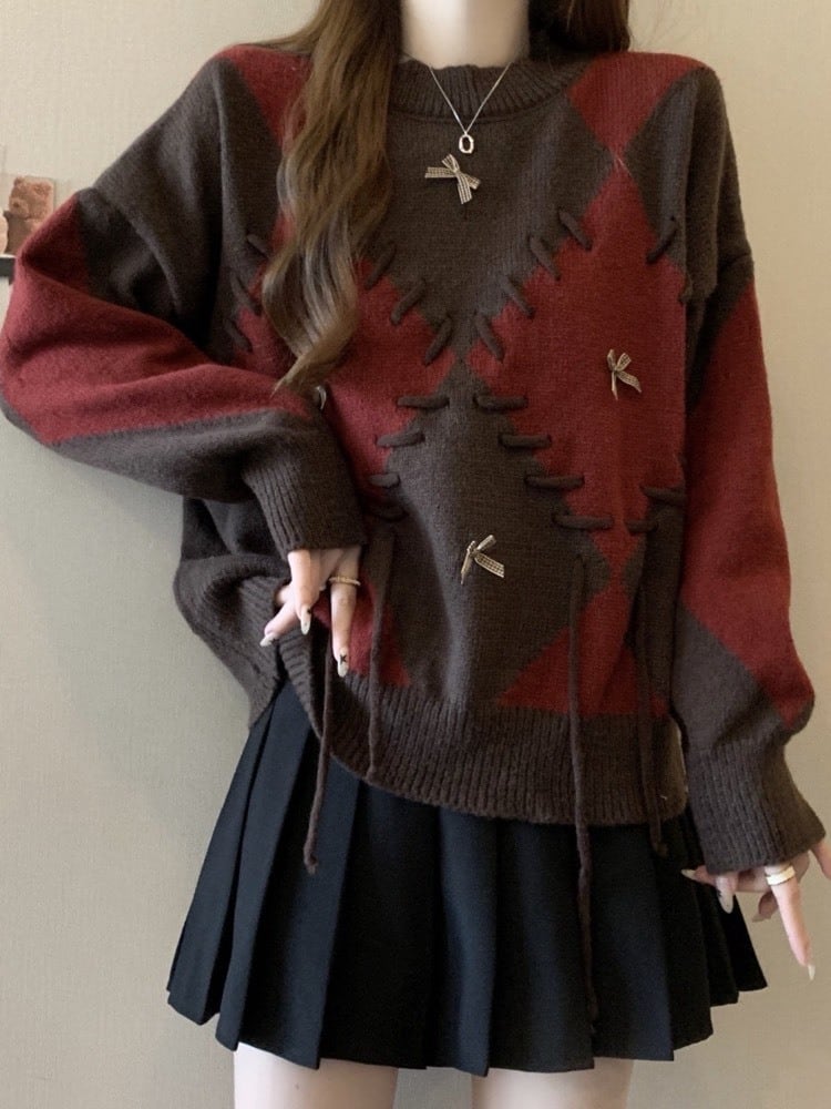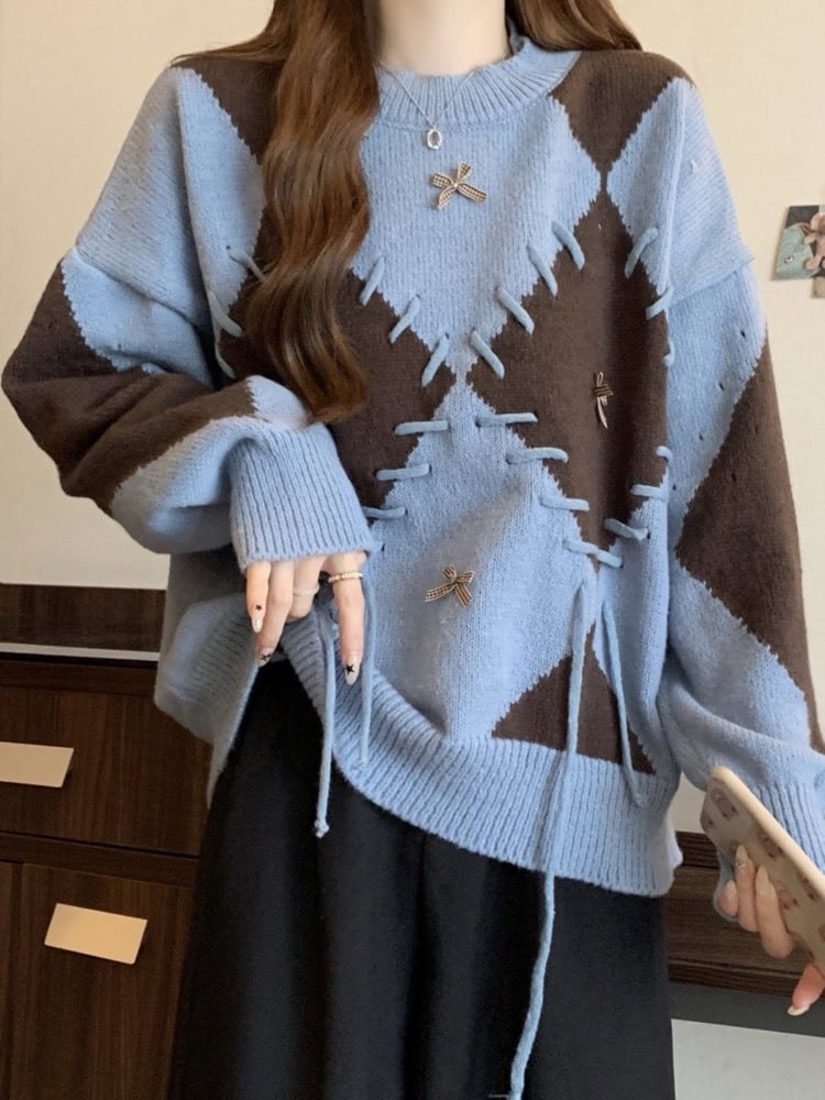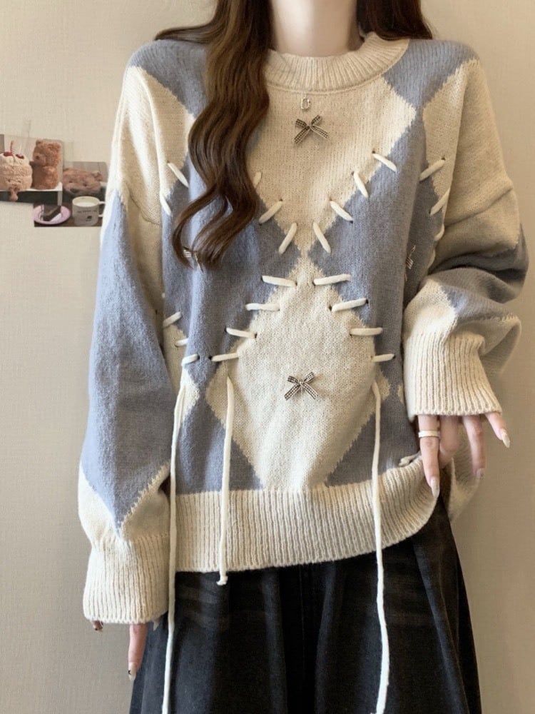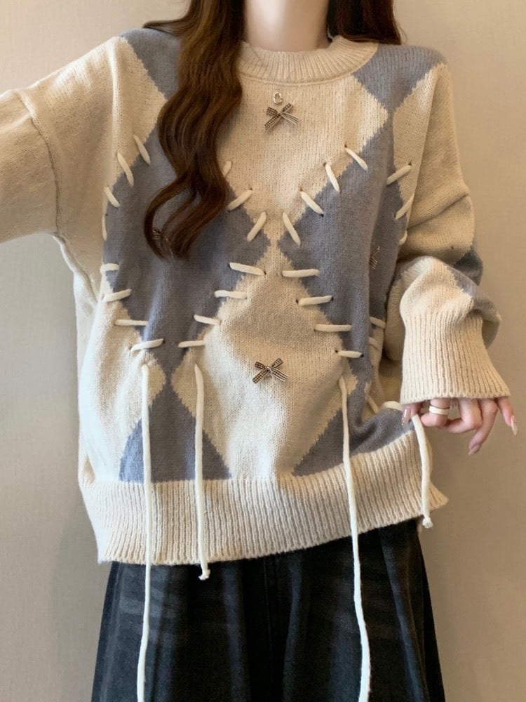 さりげなく甘い リボンアーガイルニット ダイヤ柄 長袖 大人可愛い 大人ナチュラル きれいめカジュアル 体型カバー 大きいサイズ 韓国 CH11431