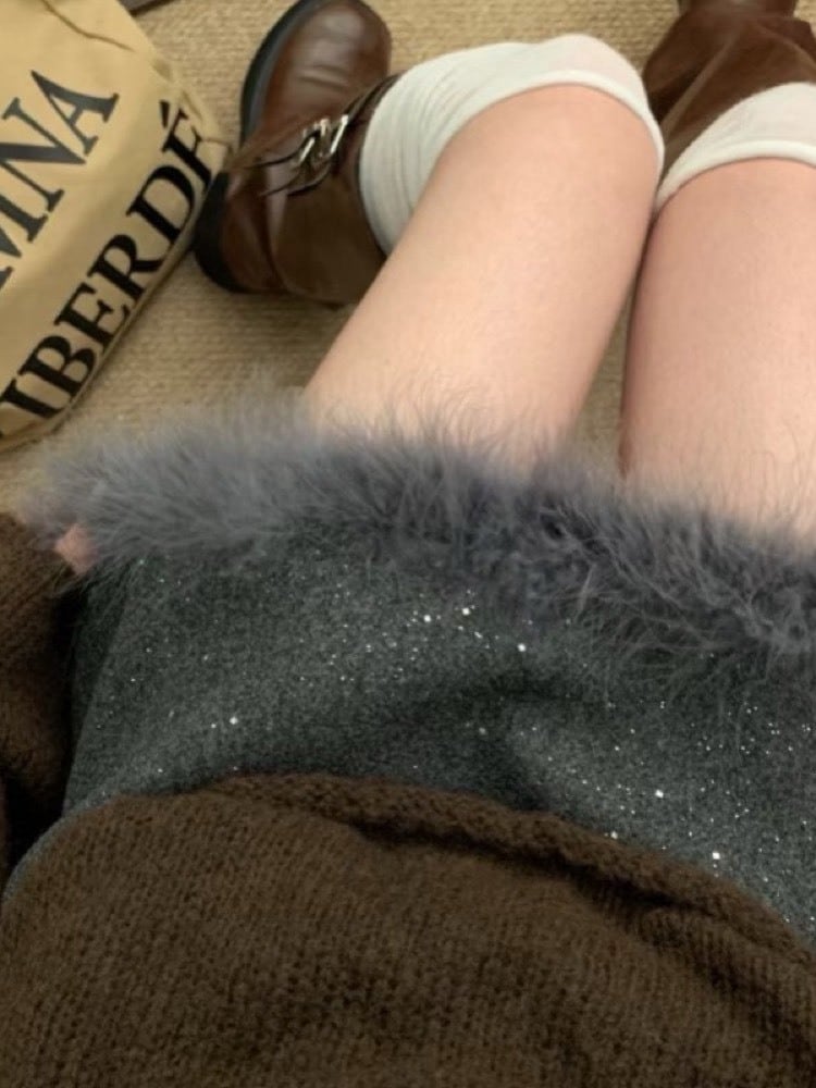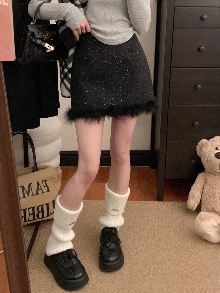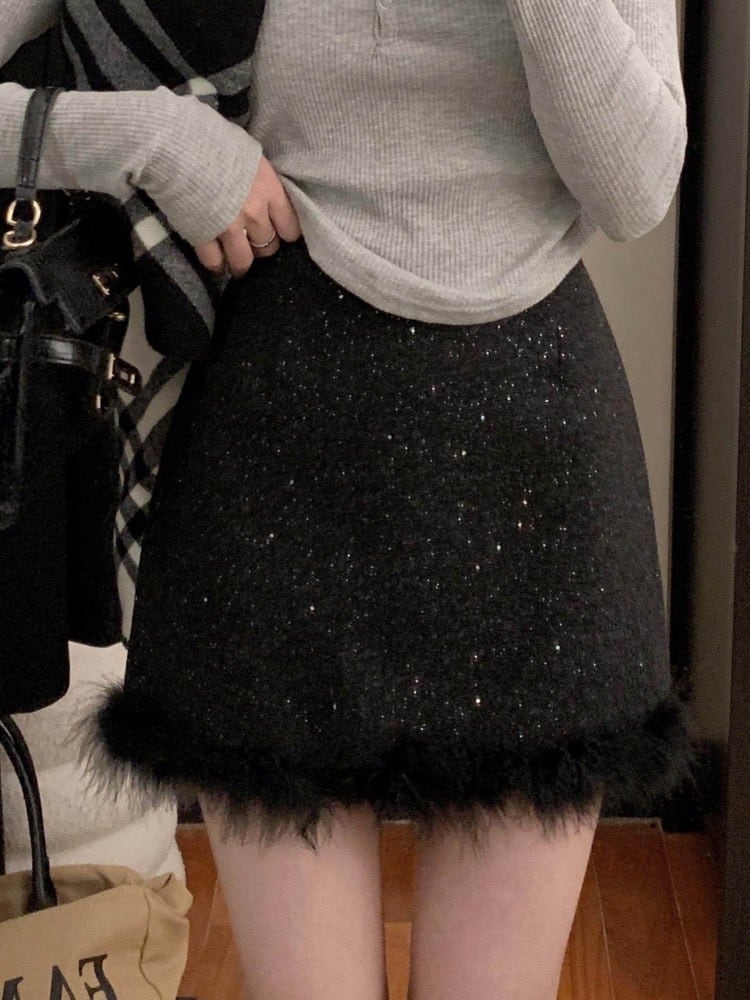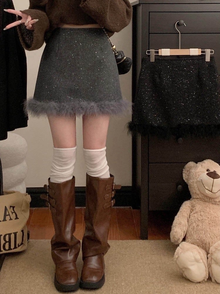 さりげなく輝くラメ素材に、裾のフェザーデザインが目を惹くミニスカート。