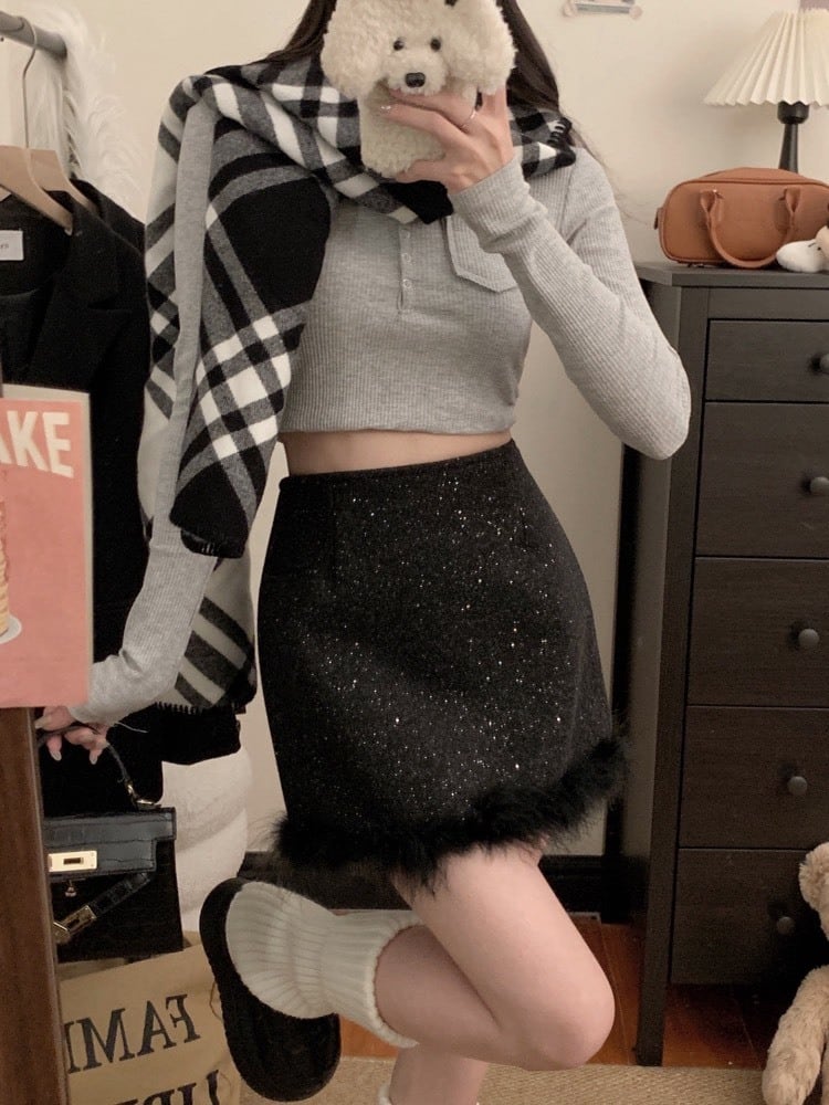 きらめきとフェザーで差がつく ファーミニスカート 大人可愛い おしゃれ 美脚 タイト 細見え 大きいサイズ 韓国 CH11440