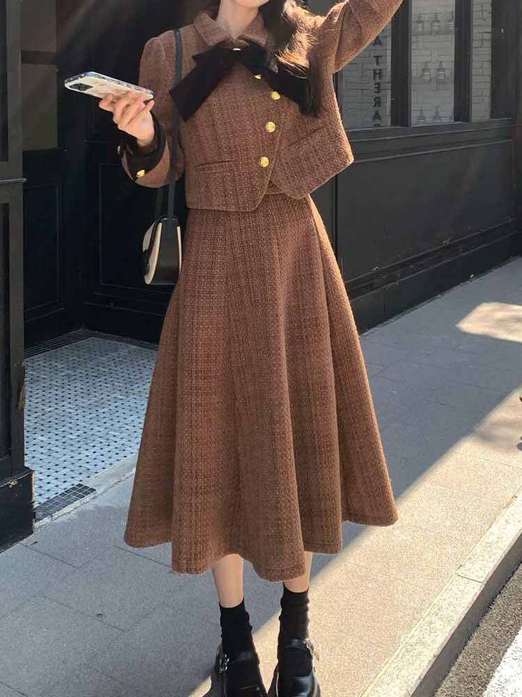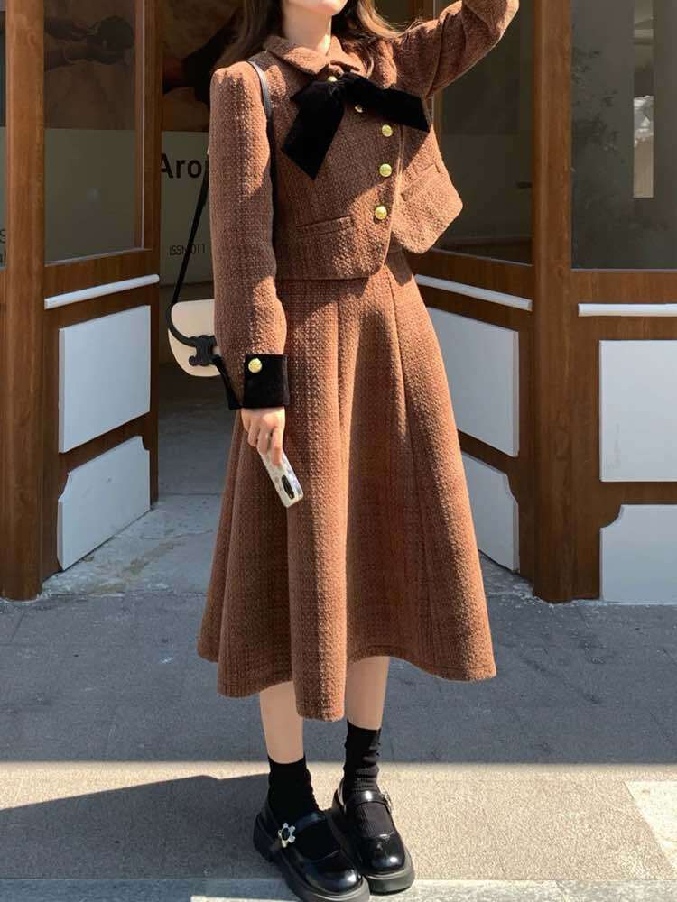 配色が可愛い♡褒められコーデ チェック柄ショートジャケット×ロングフレアスカート セットアップ 秋冬 おしゃれ 大人可愛い 上品 チェック柄 ゴールド 異素材 ベロア カジュアル お呼ばれ 細見え 大きいサイズ 韓国 CH11401