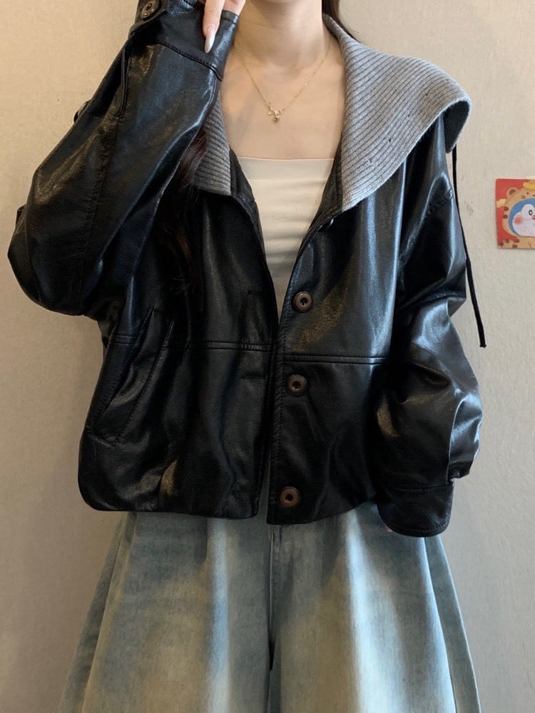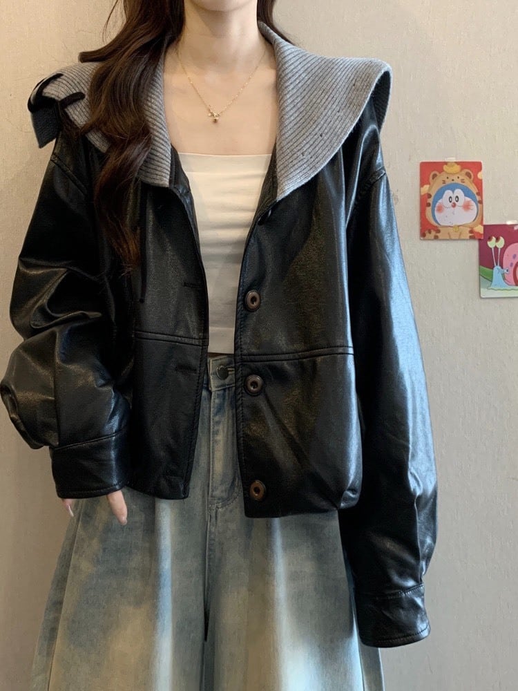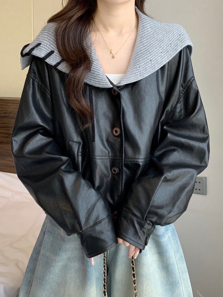 韓国っぽムード漂うニット襟レザージャケット。