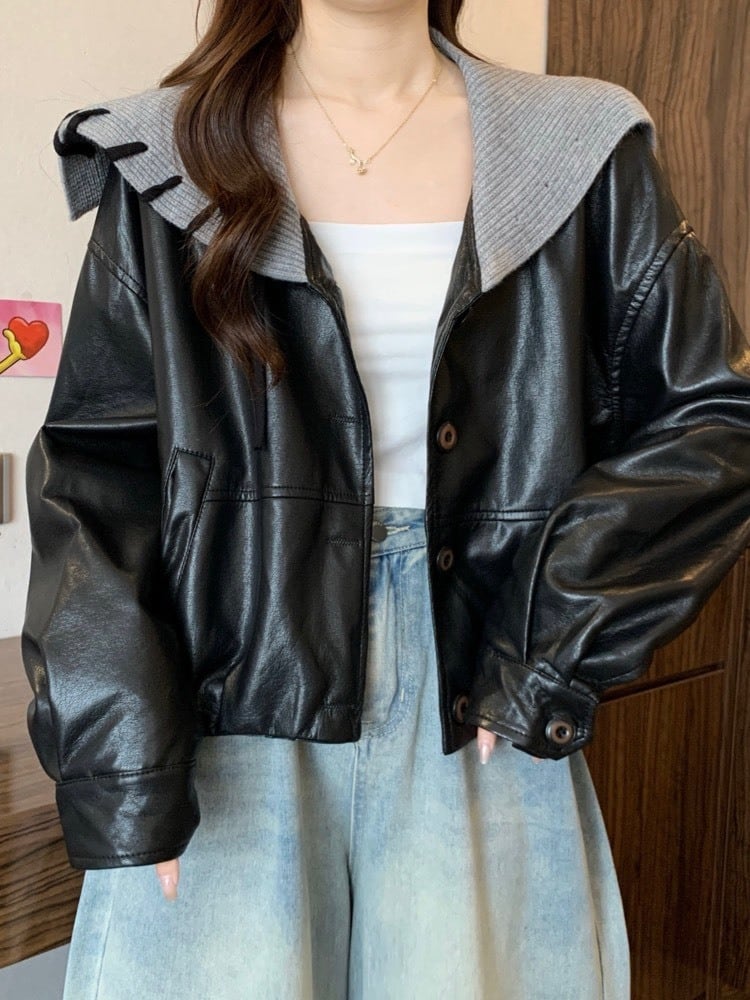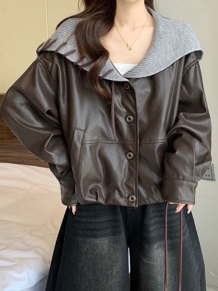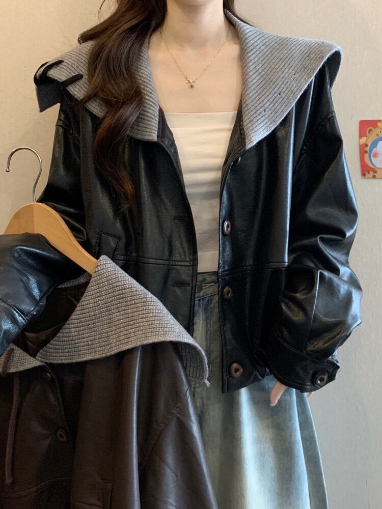 ラフなのに洒落る ニット襟レザージャケット おしゃれ 大人可愛い カジュアル 細見え 体型カバー 大きいサイズ 韓国 CH11444
