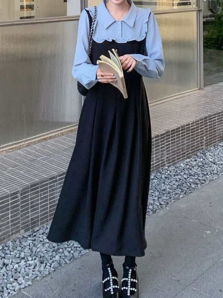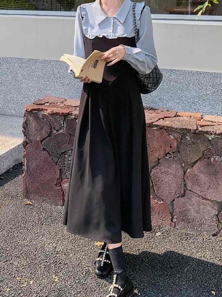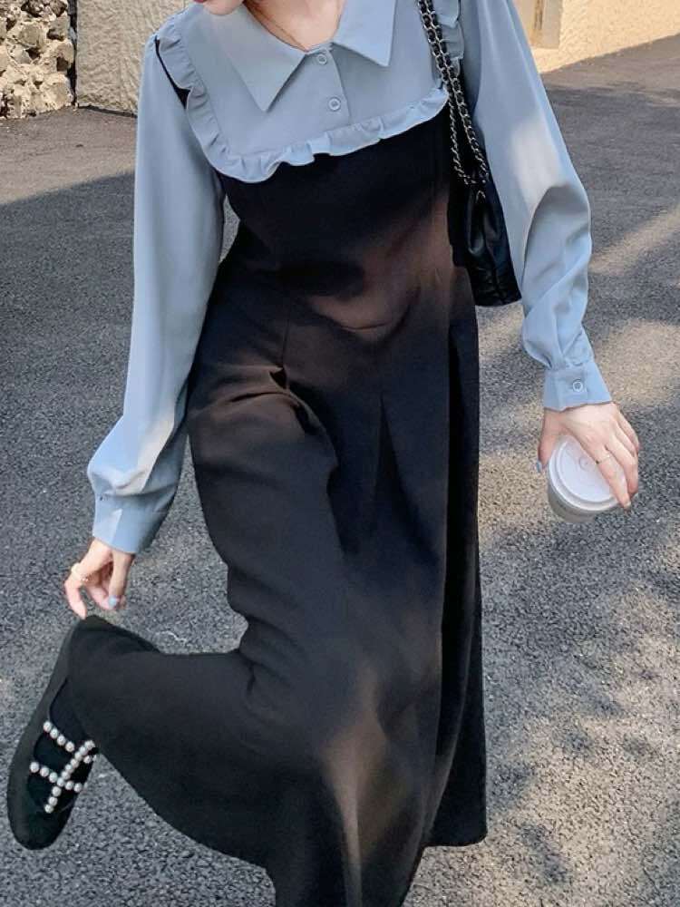 大人ガーリーもスタイルアップも欲張っちゃう♡ フリルシャツドッキングワンピース 大人可愛い フリル レイヤード風 きれいめ おしゃれ 上品 お呼ばれ 細見え 体型カバー 大きいサイズ 韓国 CH11405