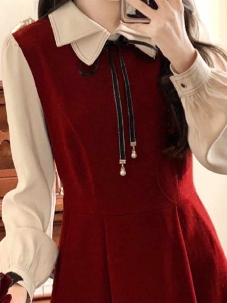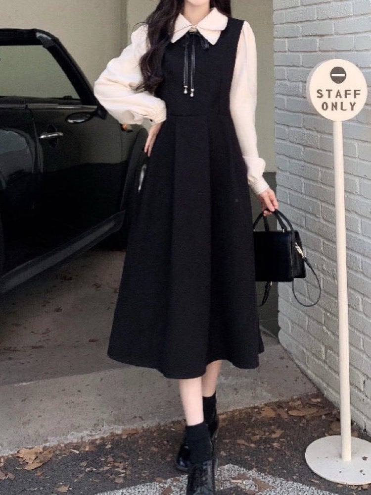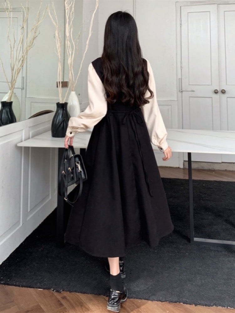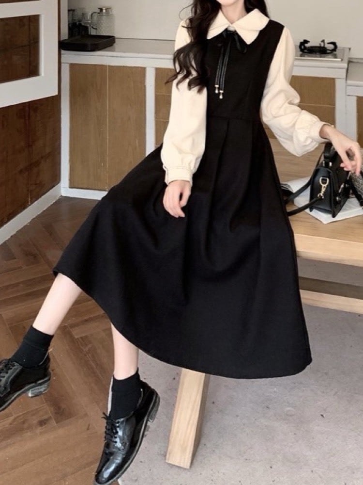 クラシカルに映える 配色フレアワンピース 大人可愛い お洒落 ロング丈 肌見せ 細見え くびれ 体型カバー 大きいサイズ 韓国 CH11456