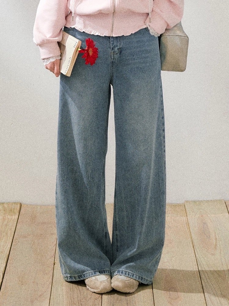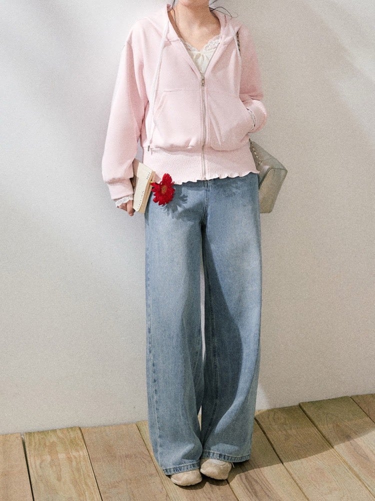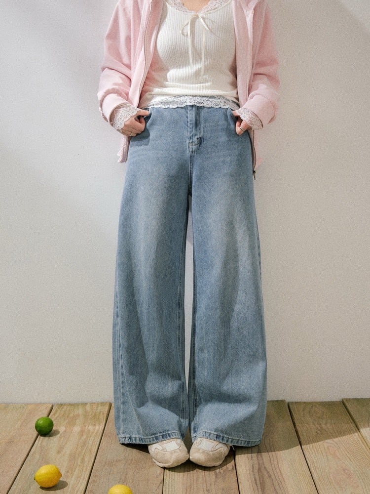 程よく色落ちしたデニムカラーと、ストンと落ちるワイドシルエットで脚のラインを拾いにくく、