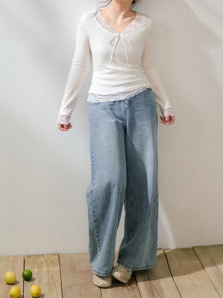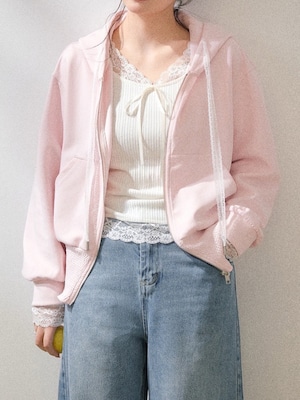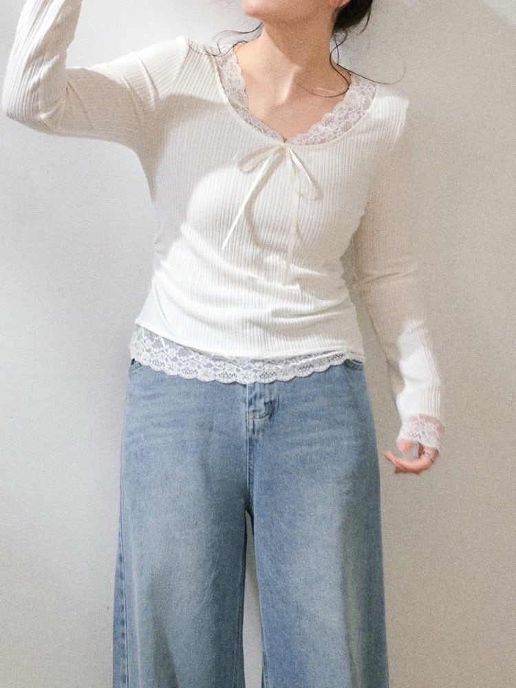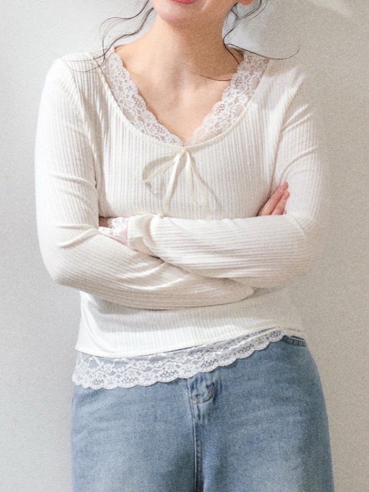首元のレースとリボンデザインが可愛い、量産・韓国ガーリーにぴったりなトップス。