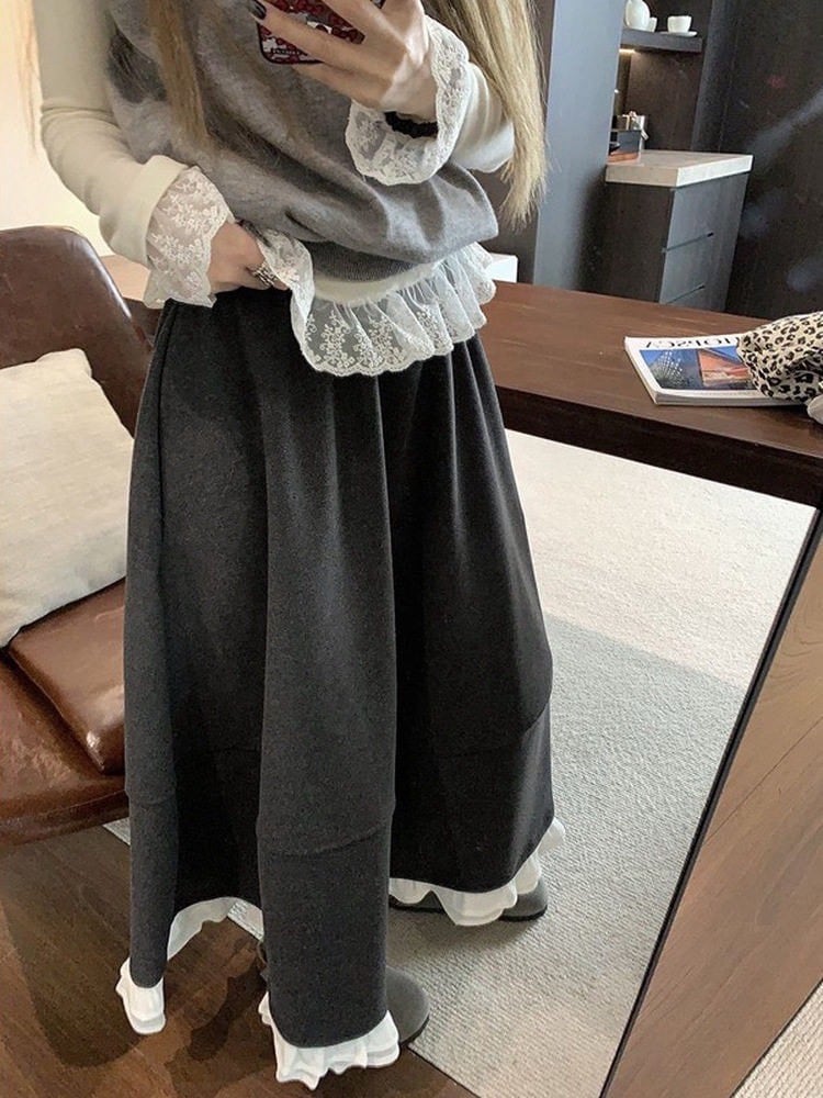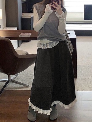さりげない可愛さを重ねて レイヤード風裾フリルスカート 大人可愛い おしゃれ 美脚 細見え 大きいサイズ 韓国 CH11453