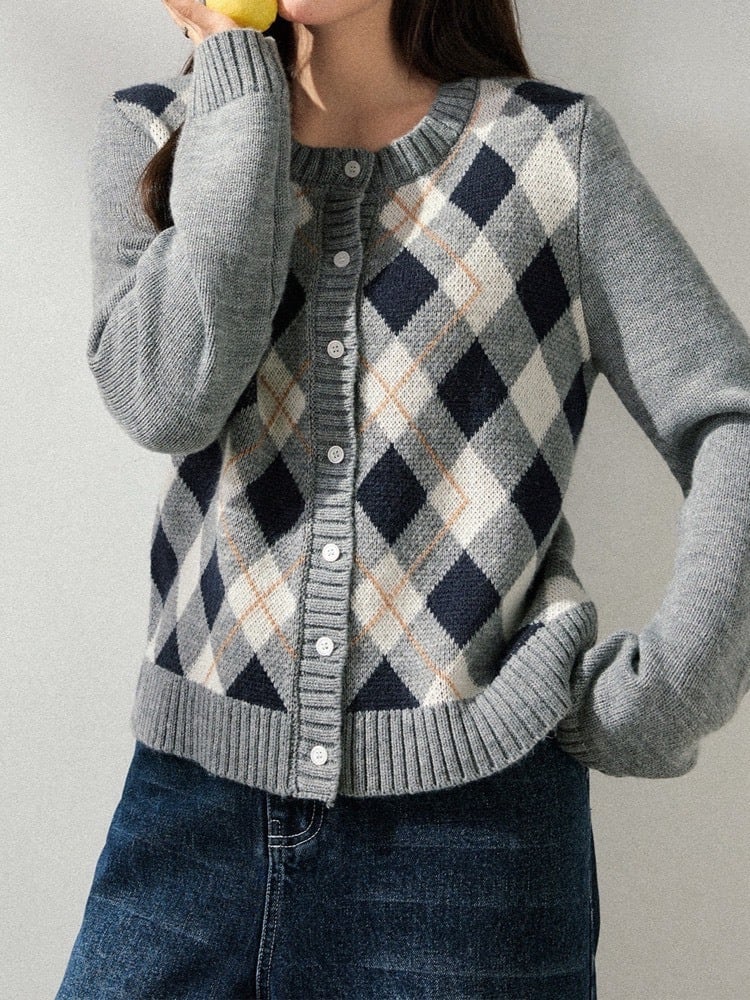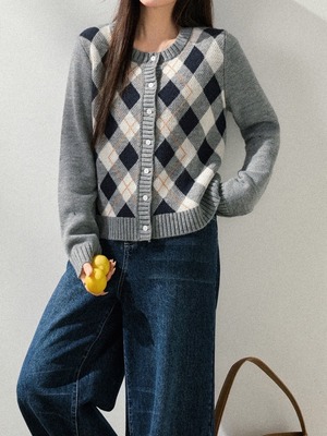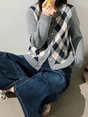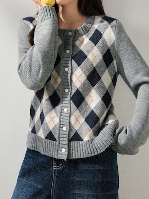 クラシックなアーガイル柄をあしらったニットカーディガン。