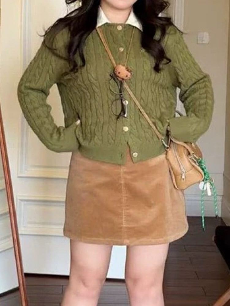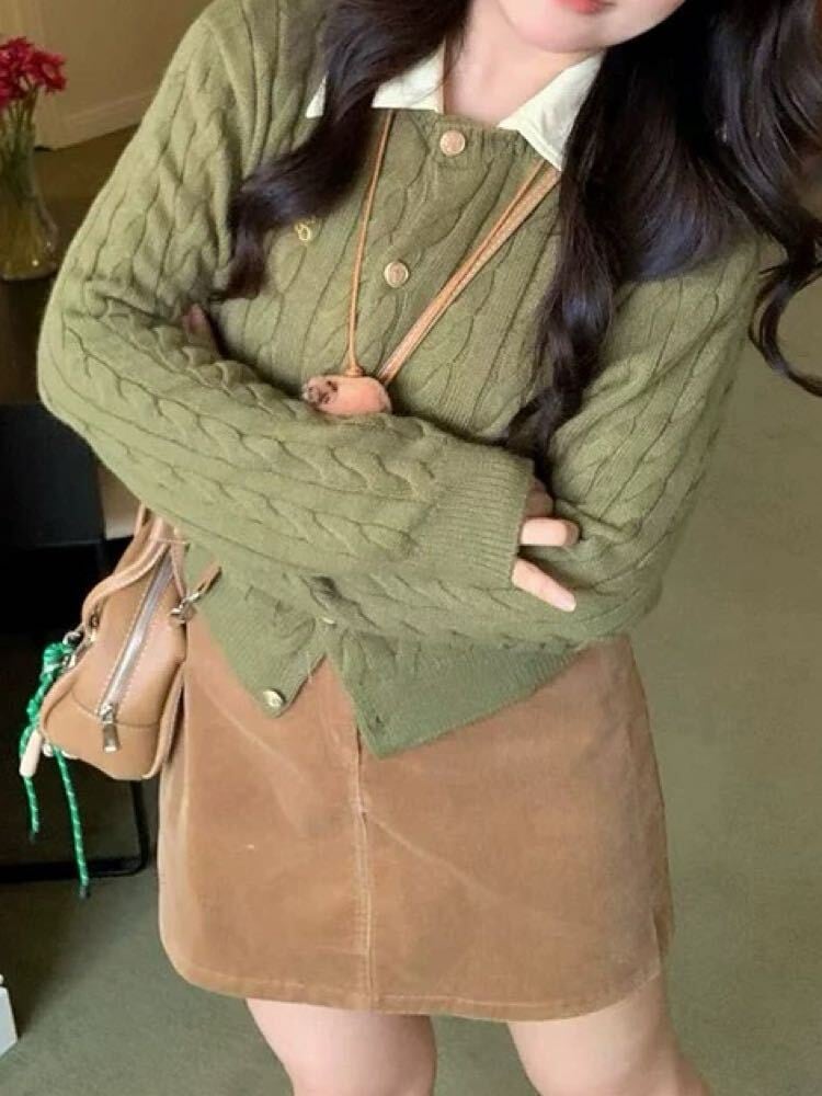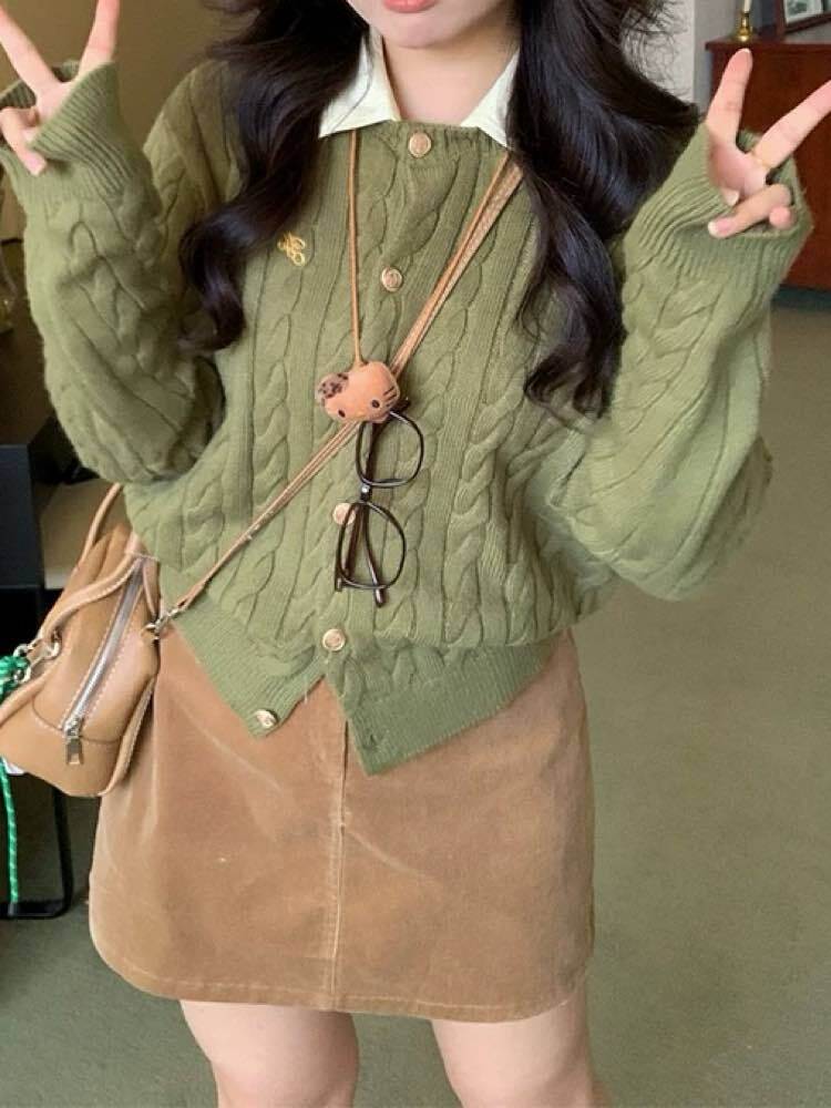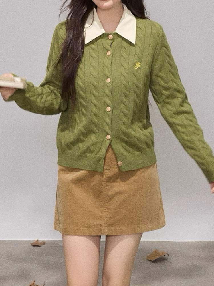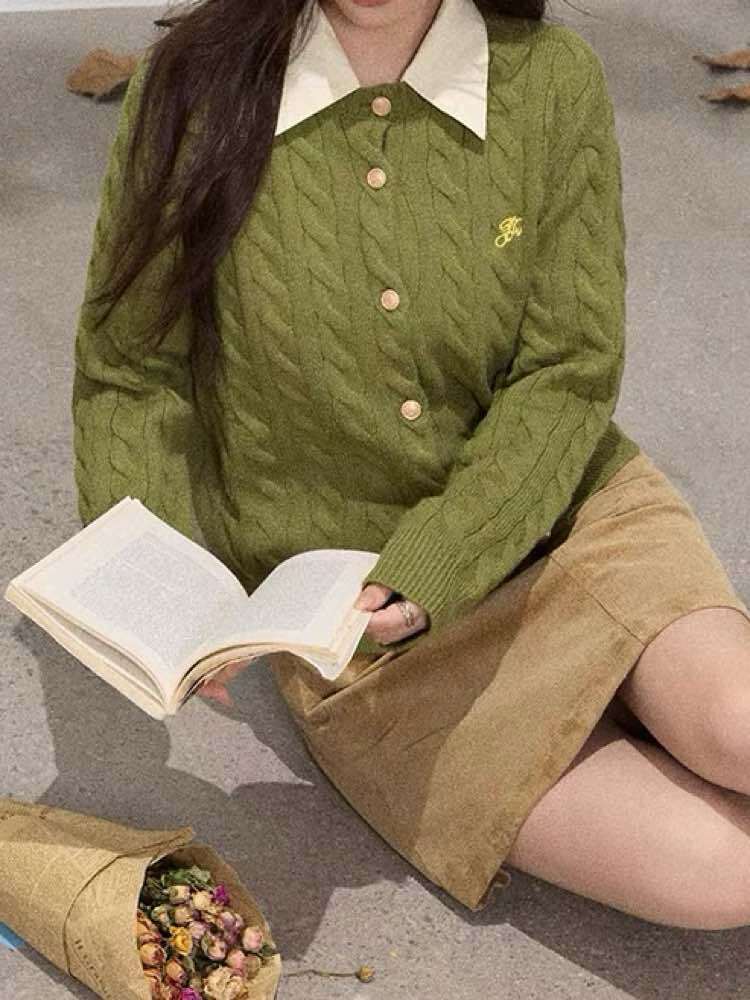 ナチュラルに盛れるキュートアイテム シャツ襟ケーブルニットカーディガン おしゃれ 大人可愛い 清楚 上品 ゴールド 刺繍 カジュアル ガーリー バイカラー 着回し 細見え 大きいサイズ 韓国 CH11408
