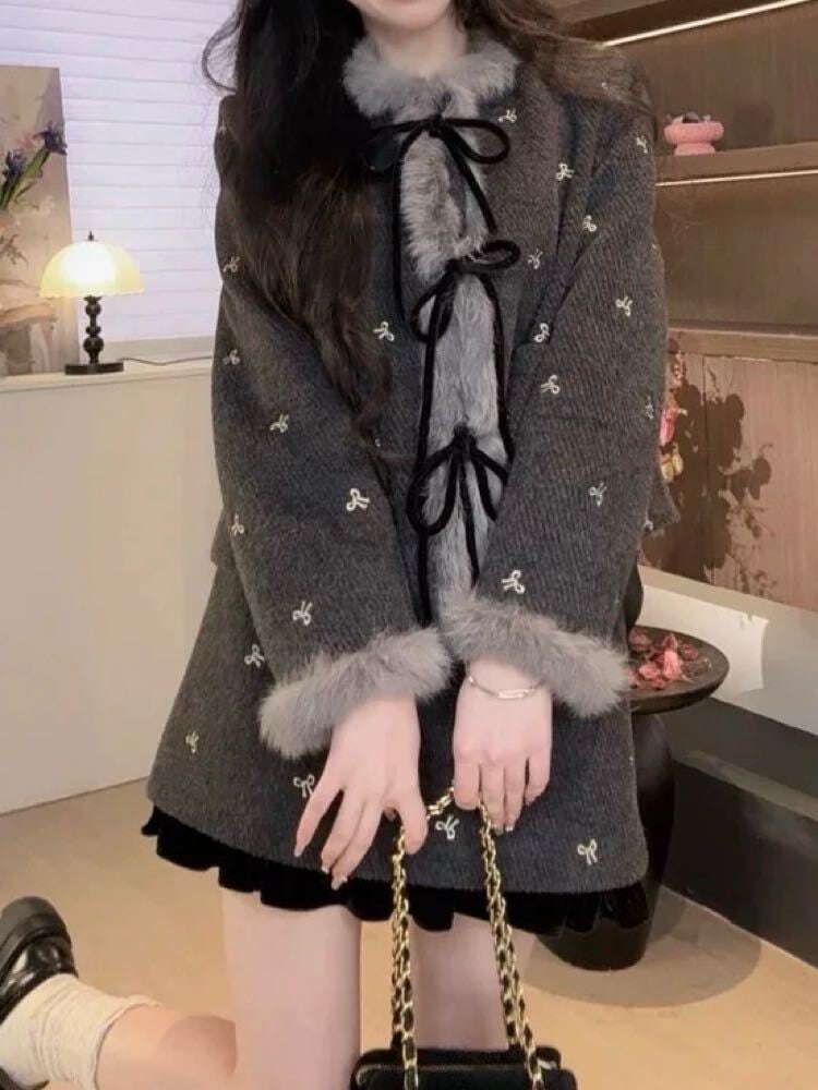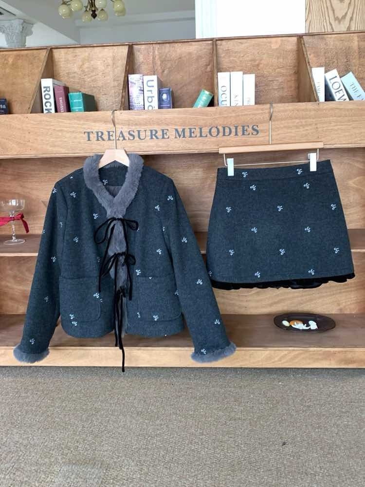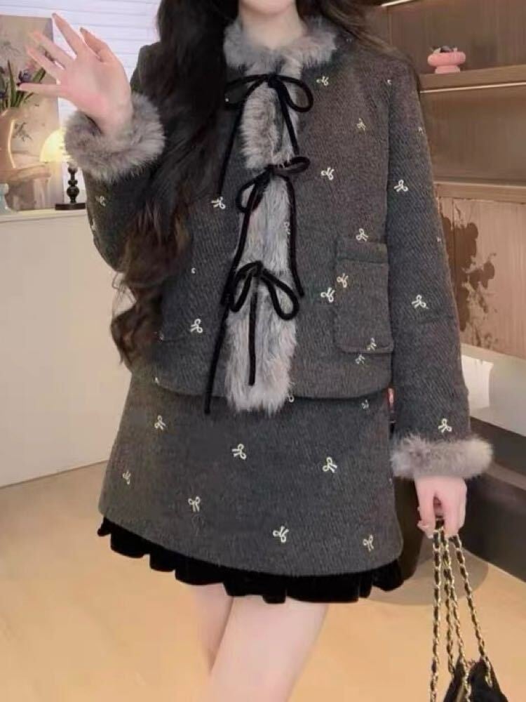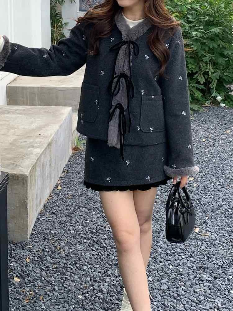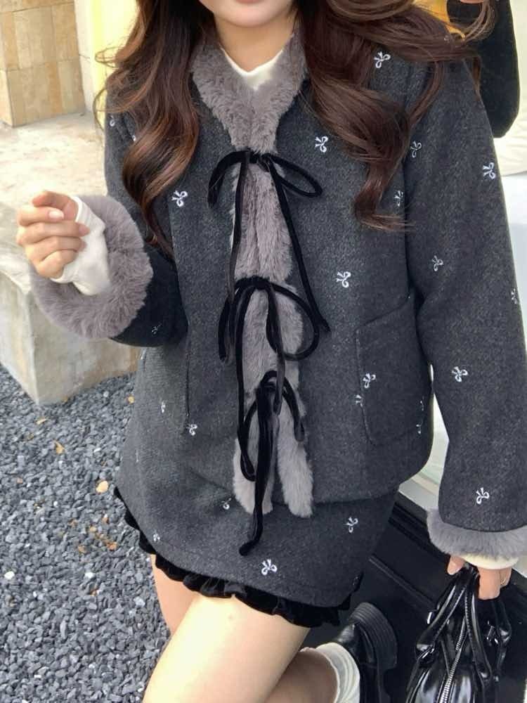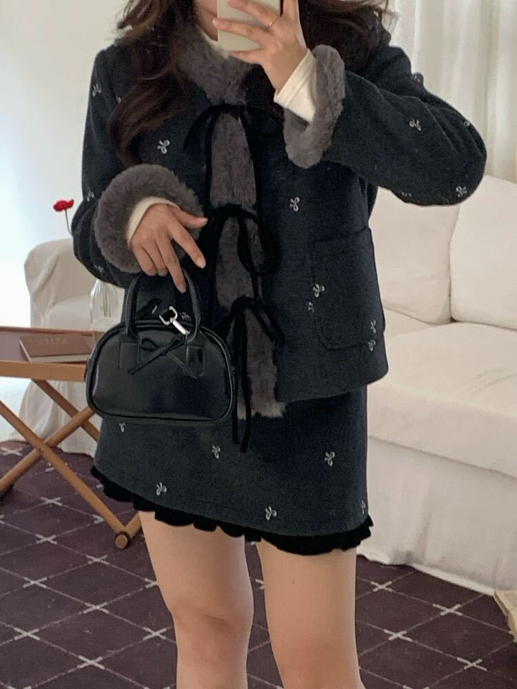 甘さもあたたかさも両立 ファー付きリボン柄セットアップ 2点セット 大人可愛い ファー リボン おしゃれ ガーリー 着映え 秋冬 異素材 お呼ばれ デート 脚長 細見え 大きいサイズ 韓国 CH11411