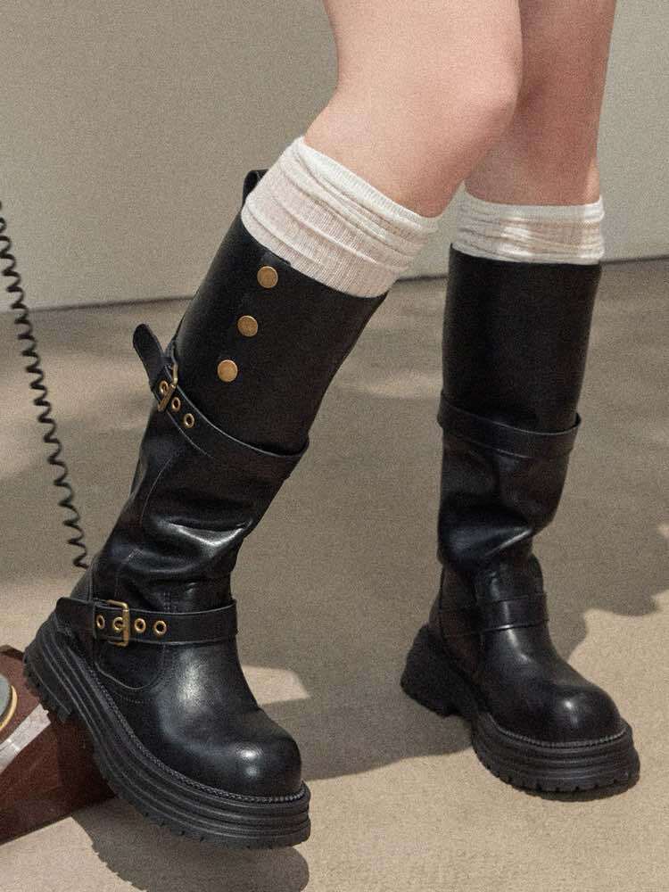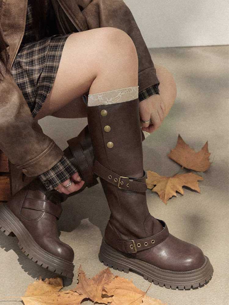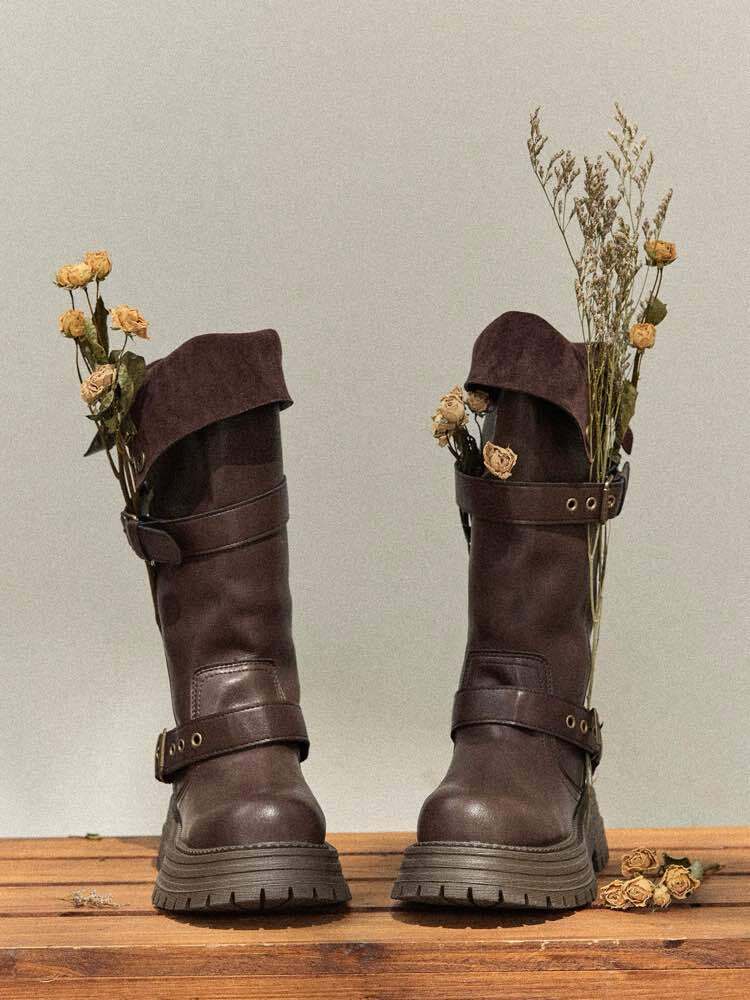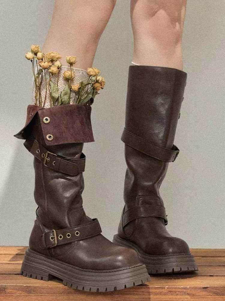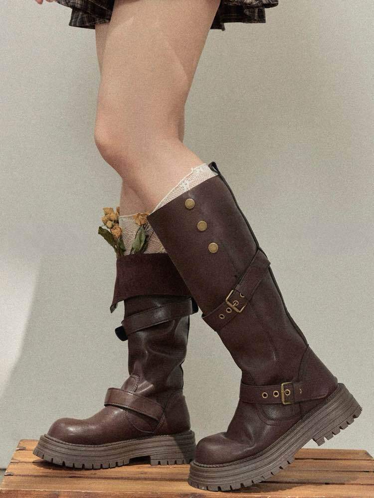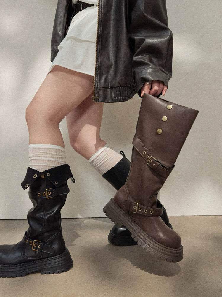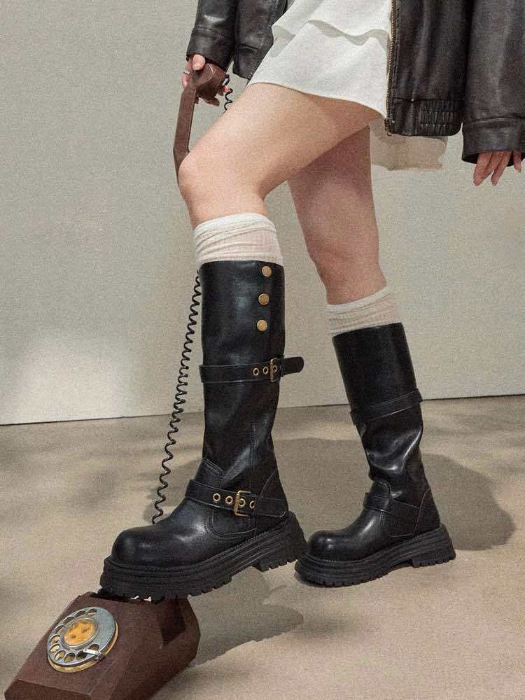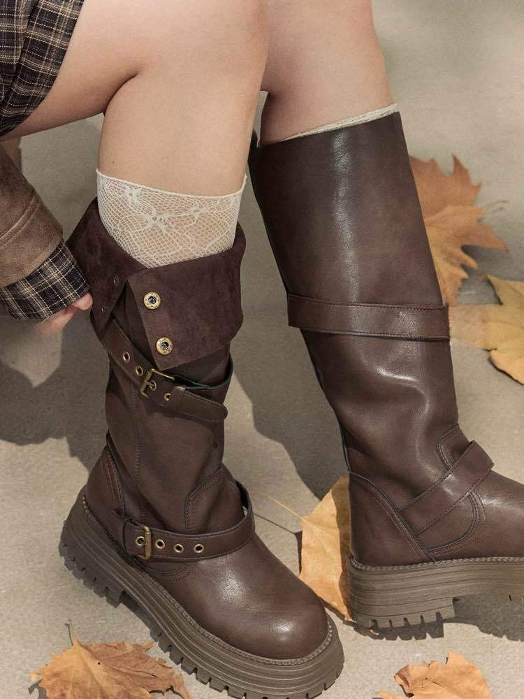 ベルトアクセントでこなれ度満点 2WAYベルトロングブーツ おしゃれ 秋冬 大人可愛い レトロ カジュアル こなれ感 脚長 細見え 大きいサイズ 韓国 CH11418
