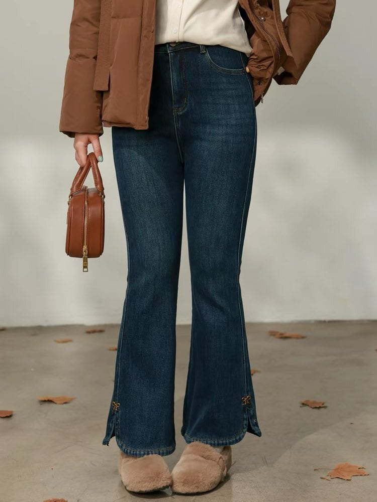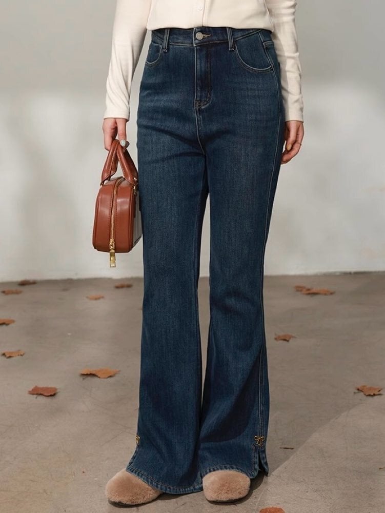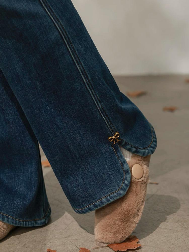 大人可愛くスタイルアップ サイドスリットフレアデニム おしゃれ 大人可愛い リボン こなれ感 カジュアル 脚長 細見え フレア デイリー おでかけ 大きいサイズ 韓国 CH11422