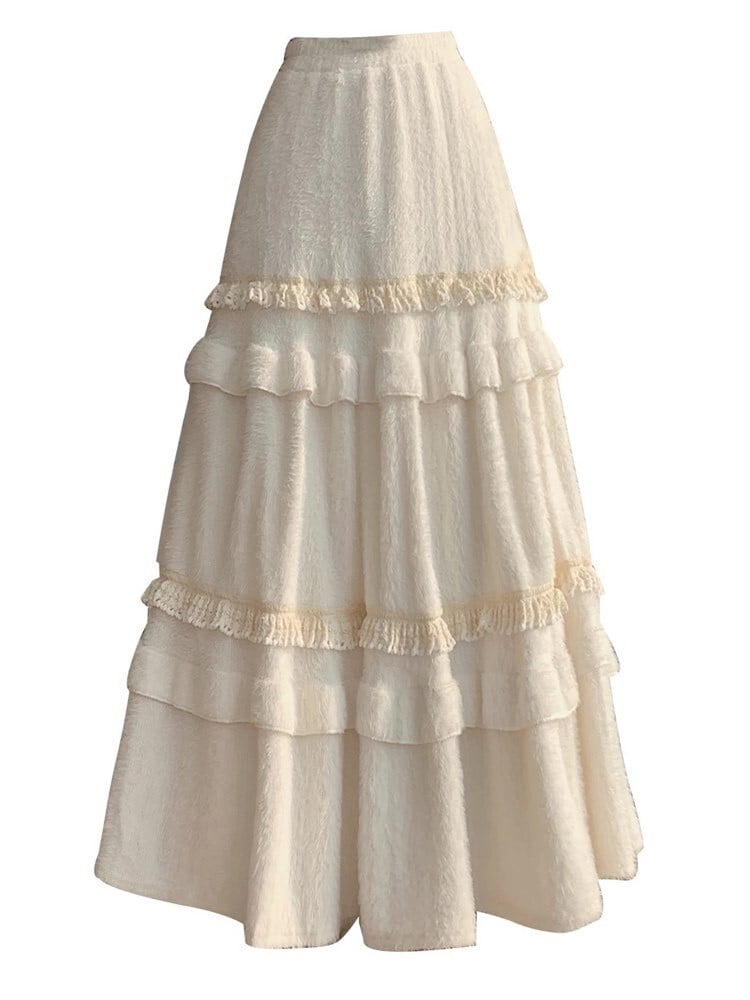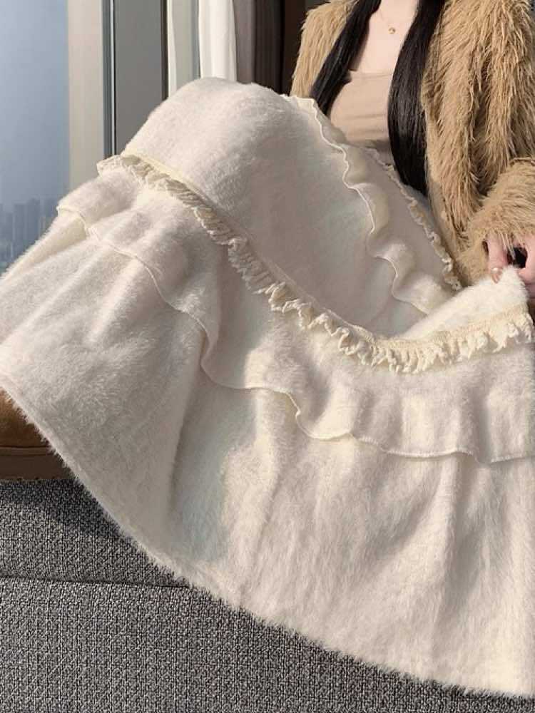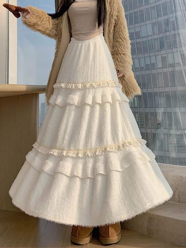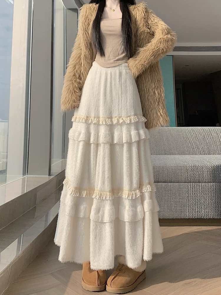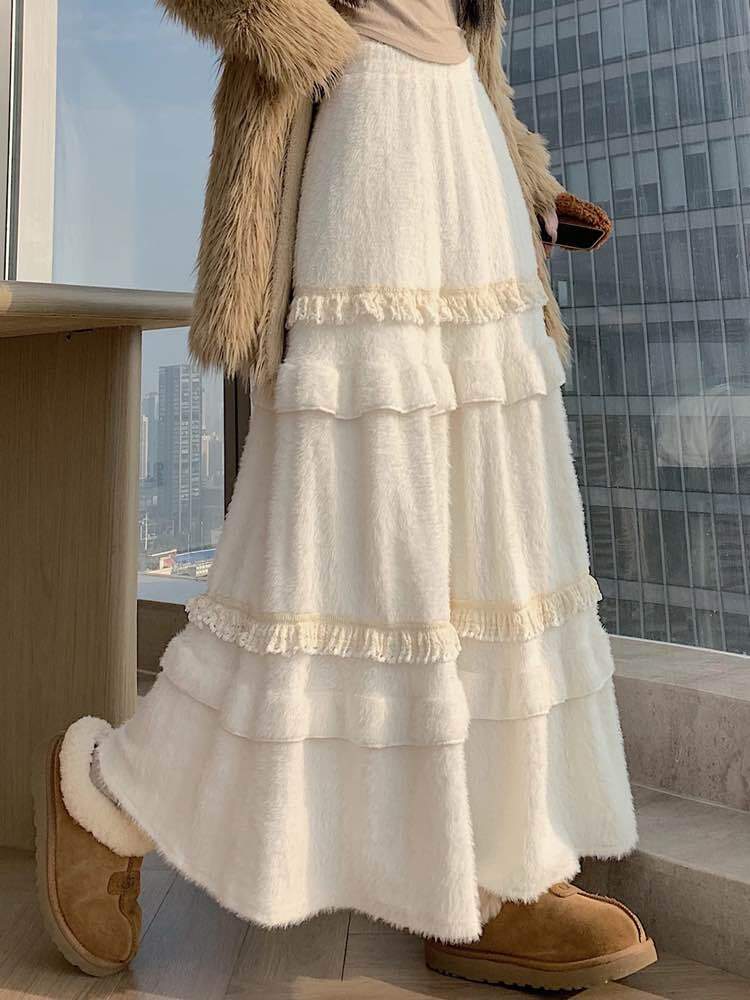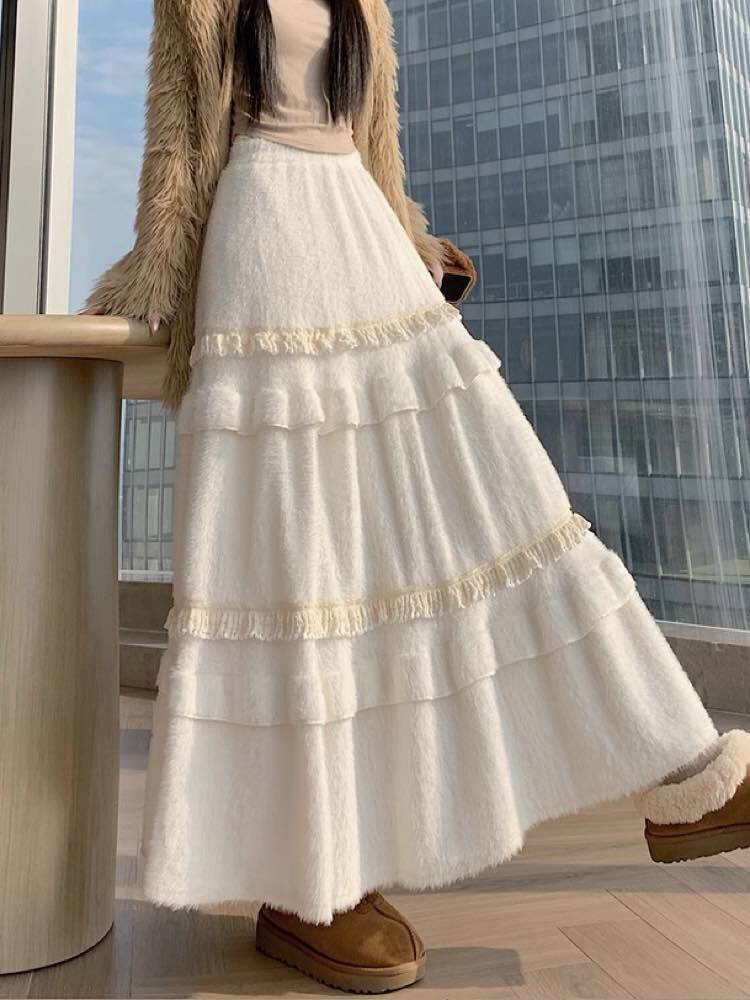 冬の主役級愛されスカート コットンフリルファーティアードスカート 大人可愛い ふわふわ ファー フリル おしゃれ ガーリー カジュアル 温か Aライン 体型カバー 大きいサイズ 韓国 CH11425
