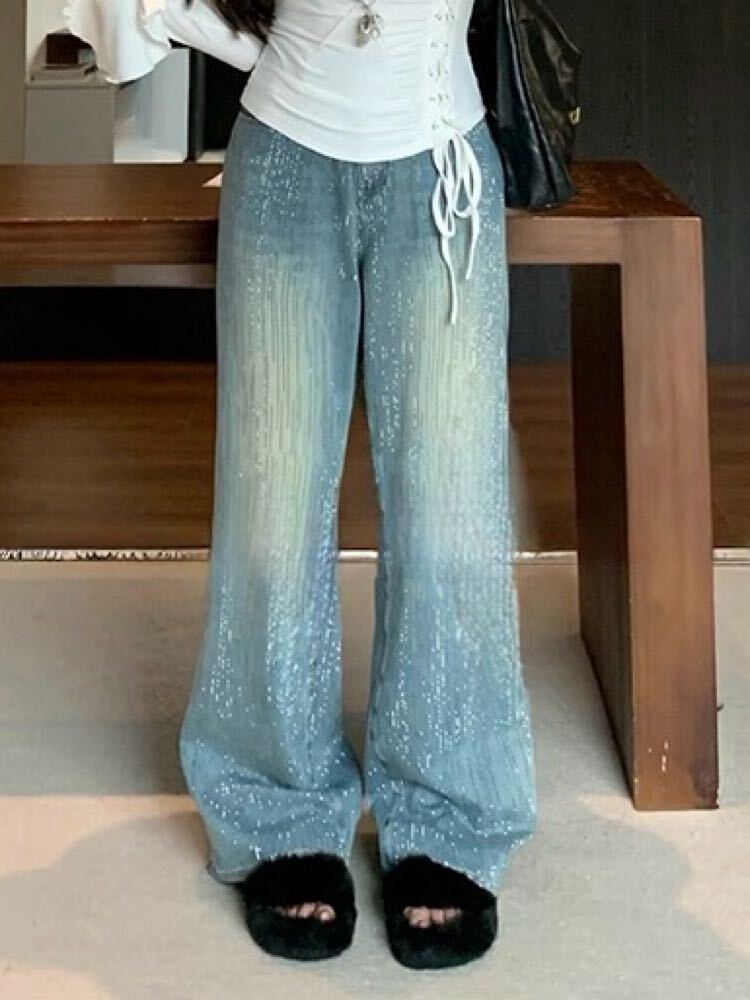 視線集める本命ボトムス ビジューデニムパンツ 大人可愛い おしゃれ ビジュー カジュアル 着映え 細見え スタイルアップ 美脚 脚長 大きいサイズ 韓国 CH11490