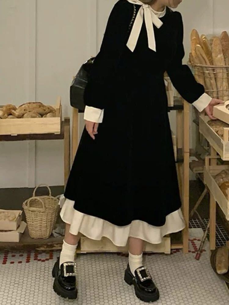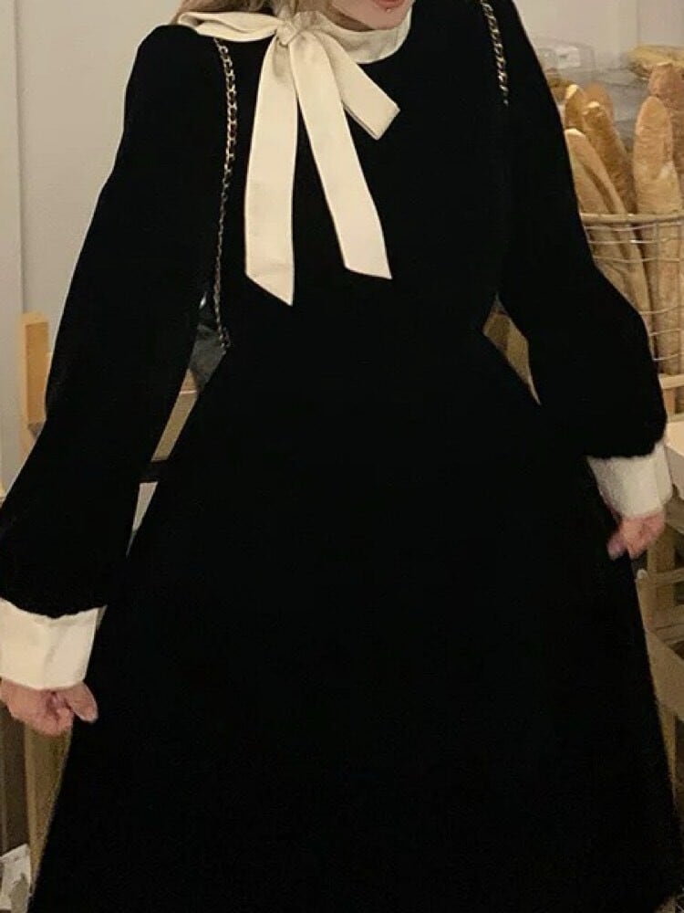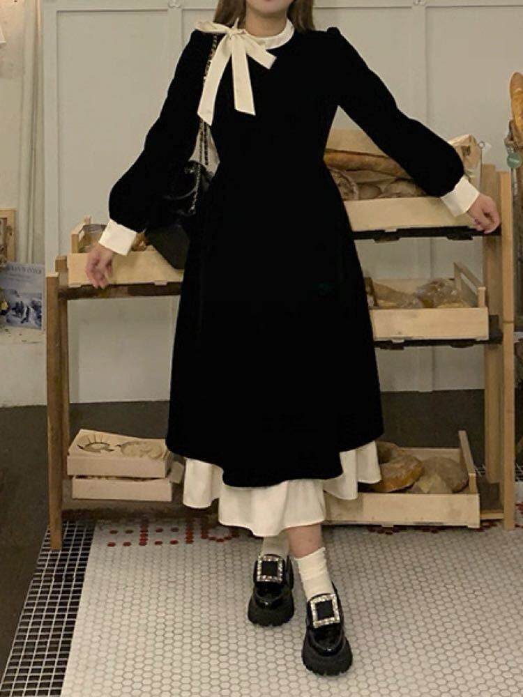 上品さを兼ね備えた大人ガーリー 丈が選べる 配色リボンクラシカルワンピース 大人可愛い クラシカル 上品 おしゃれ リボン バイカラー きれいめ お呼ばれ 食事会 細見え 体型カバー 大きいサイズ 韓国 CH11492