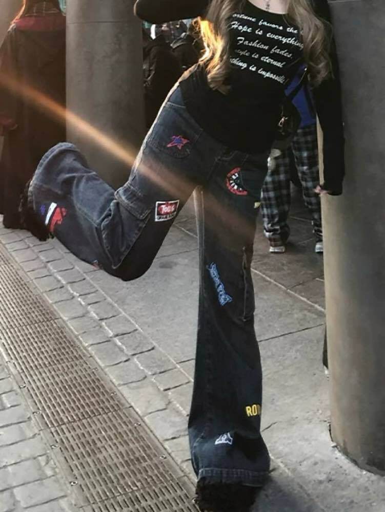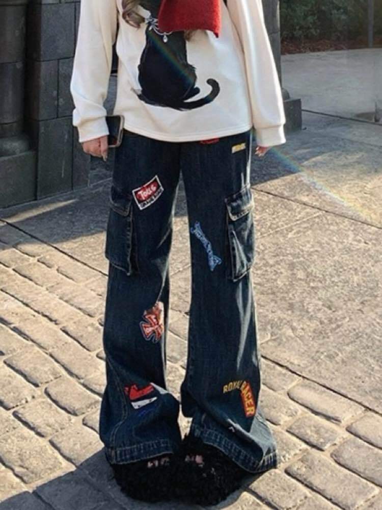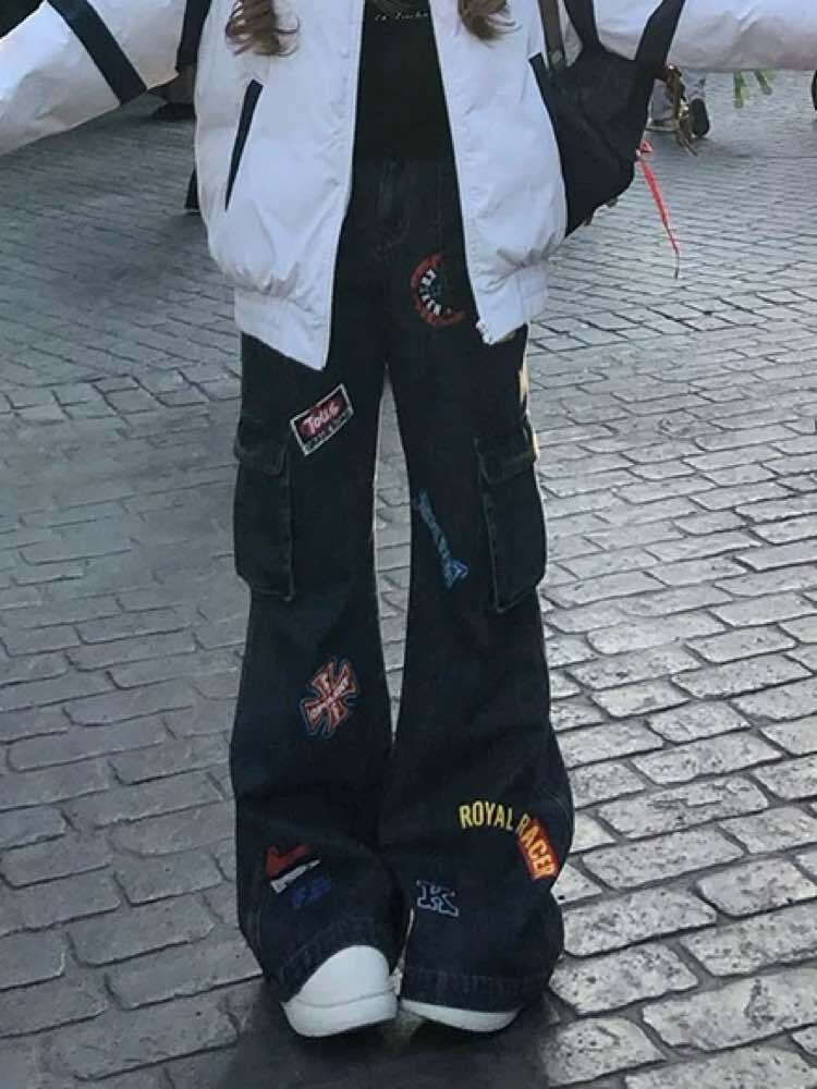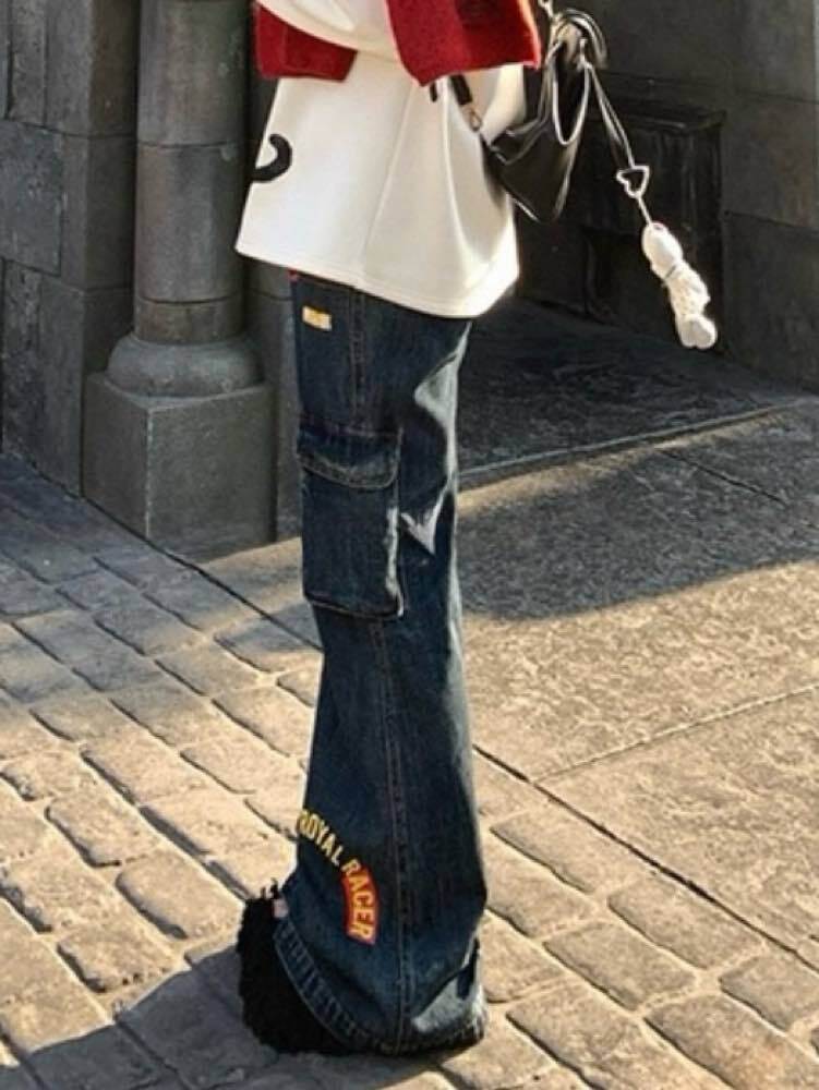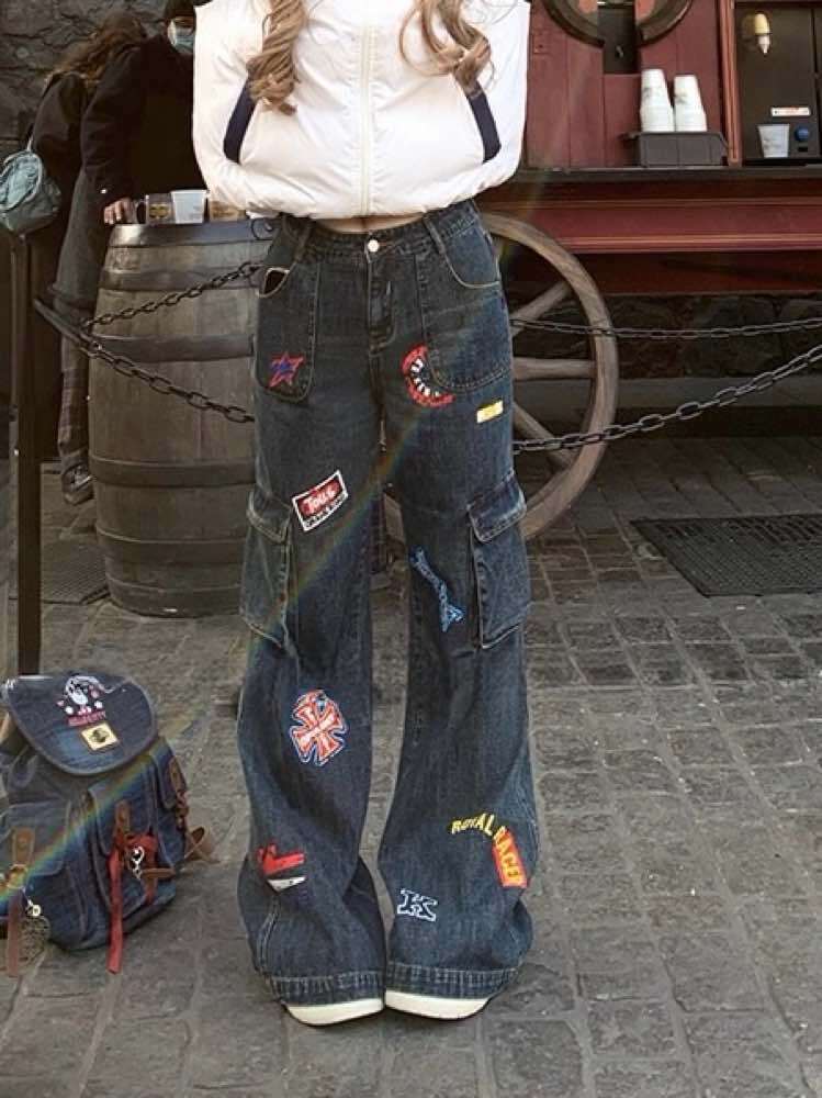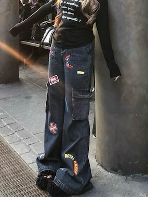 遊び心満点な大人のY2Kスタイル ロゴプリントデニムカーゴパンツ お洒落 大人可愛い ロゴ 着映え カジュアル ストリート Y2K 脚長 美脚 大きいサイズ 韓国 CH11495