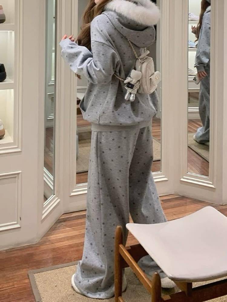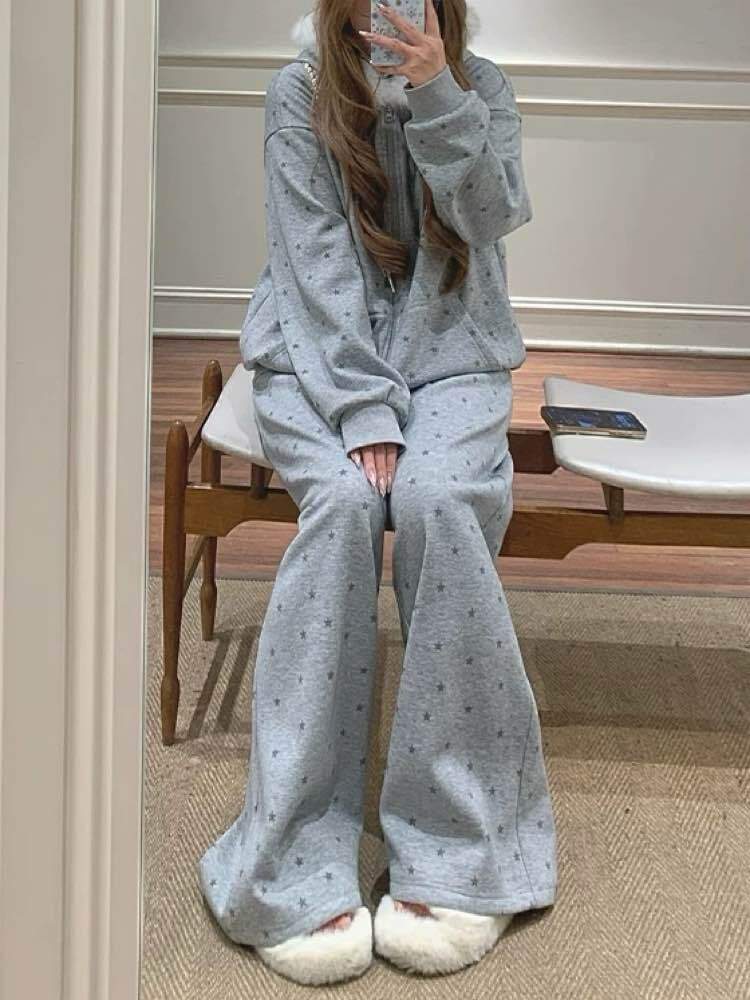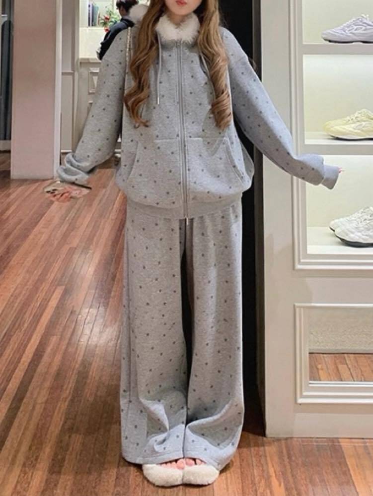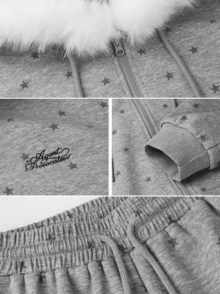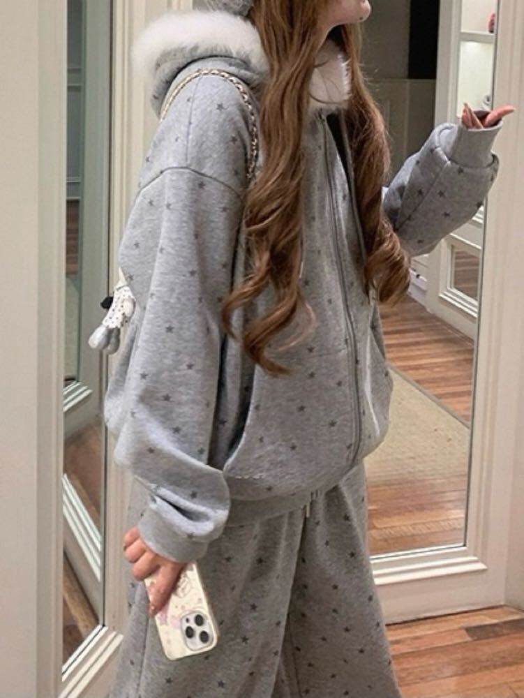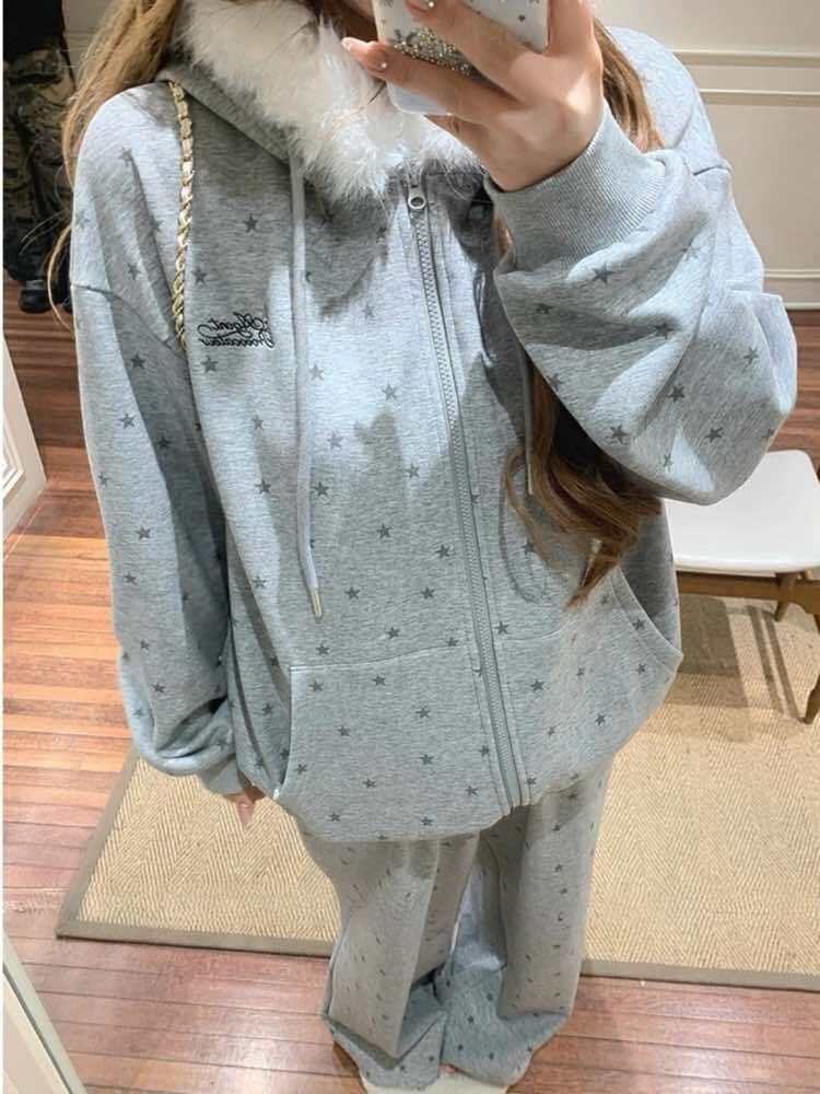 着るだけで気分高まる♪ 星柄ジップアップパーカーセットアップ 2点セット 大人可愛い おしゃれ 星柄 ファー 刺繍 ロゴ カジュアル ラフ ルームウェア リラクシー 体型カバー 大きいサイズ 韓国 CH11496
