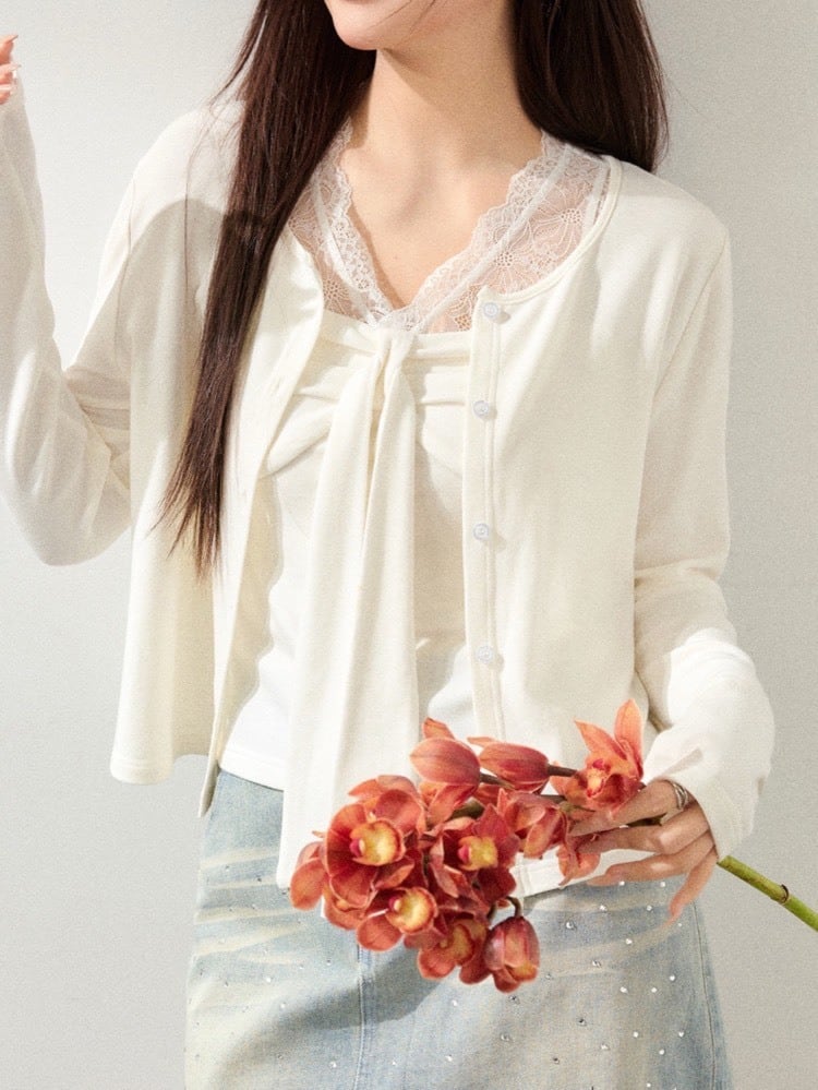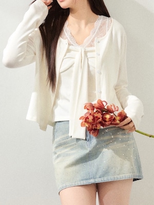 繊細なレースが美しいキャミソールと、軽やかな着心地のカーディガンをセットにした、大人フェミニンなトップスセット。