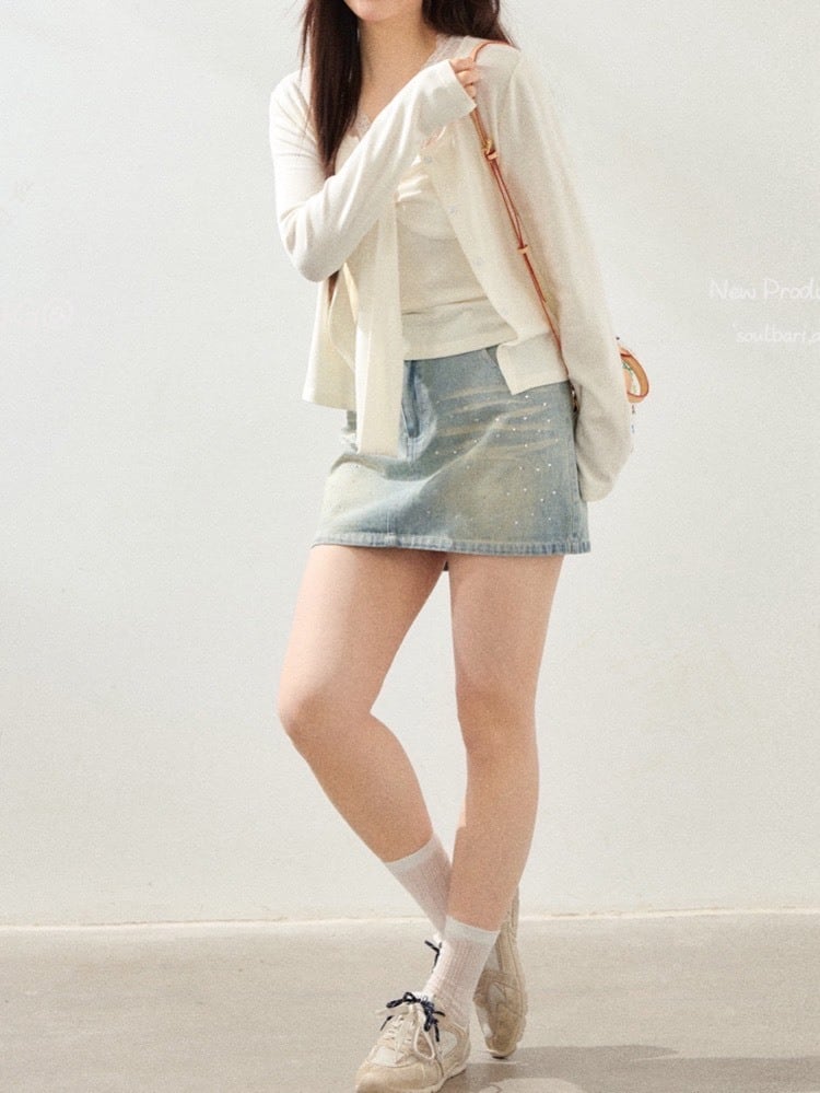 カーディガンは透け感のある柔らかな素材で、羽織るだけで抜け感のあるスタイリングに。