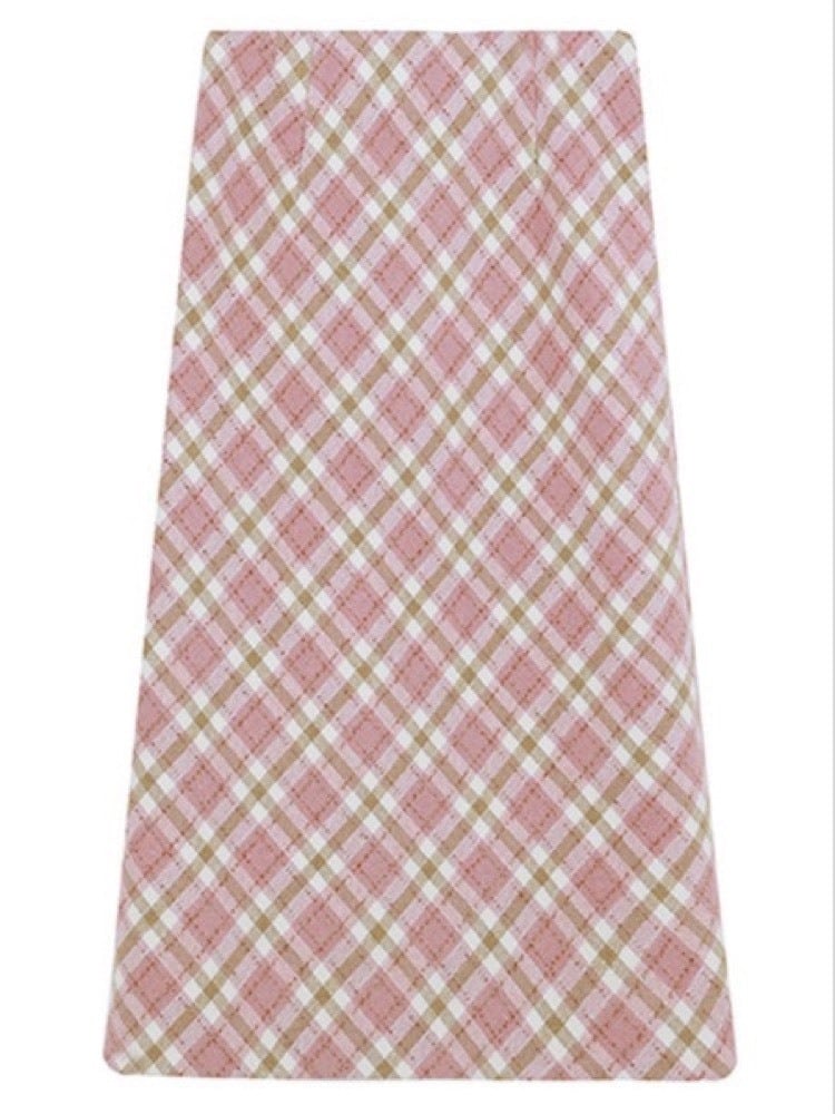 スカートは落ち着いたピンク系チェック柄で、コーデに程よい華やかさをプラスしてくれます。