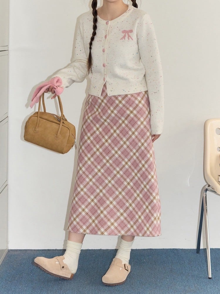 甘さと上品さのバランスが絶妙 リボンカーディガン&ピンクチェックロングスカートセット セットアップ フェミニン 楽ちん おしゃれ 大人可愛い 着回し 体型カバー 大きいサイズ 韓国 CH11470