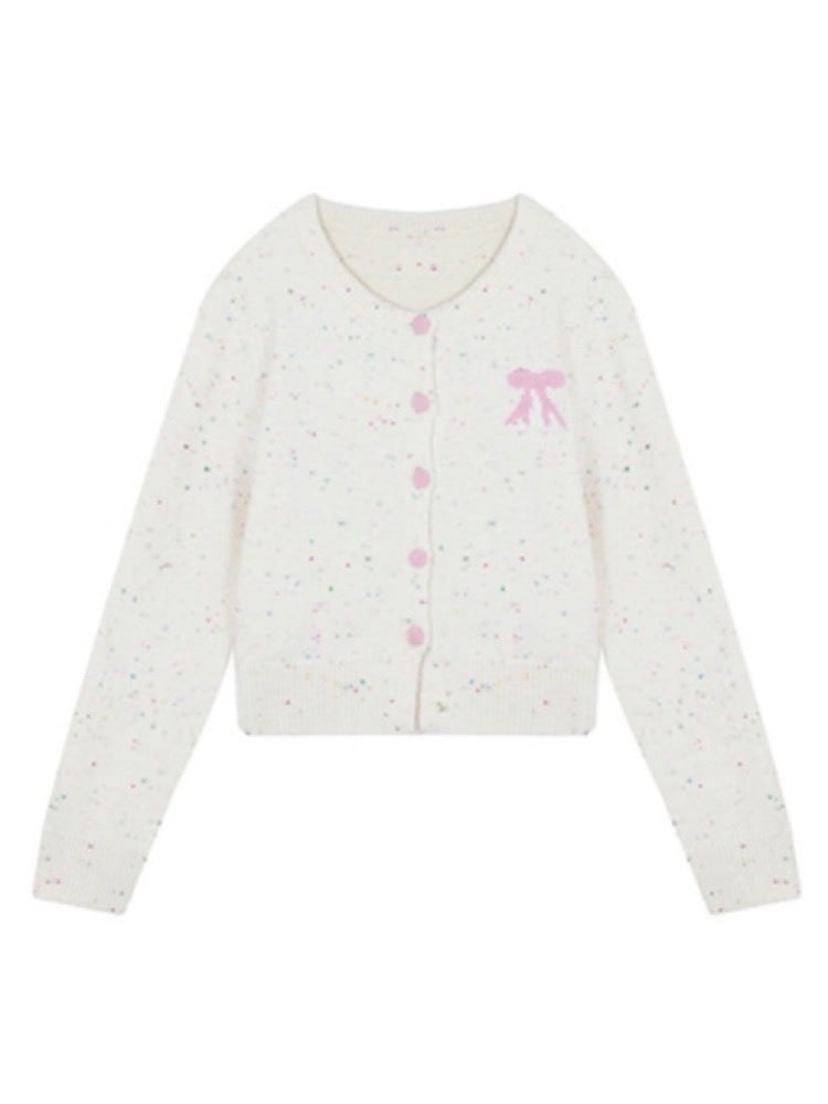 カーディガンは小さなリボンモチーフがポイントで、甘すぎず大人可愛いデザイン。