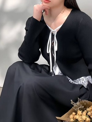 胸元の華奢なリボンと裾のレース切り替えが、